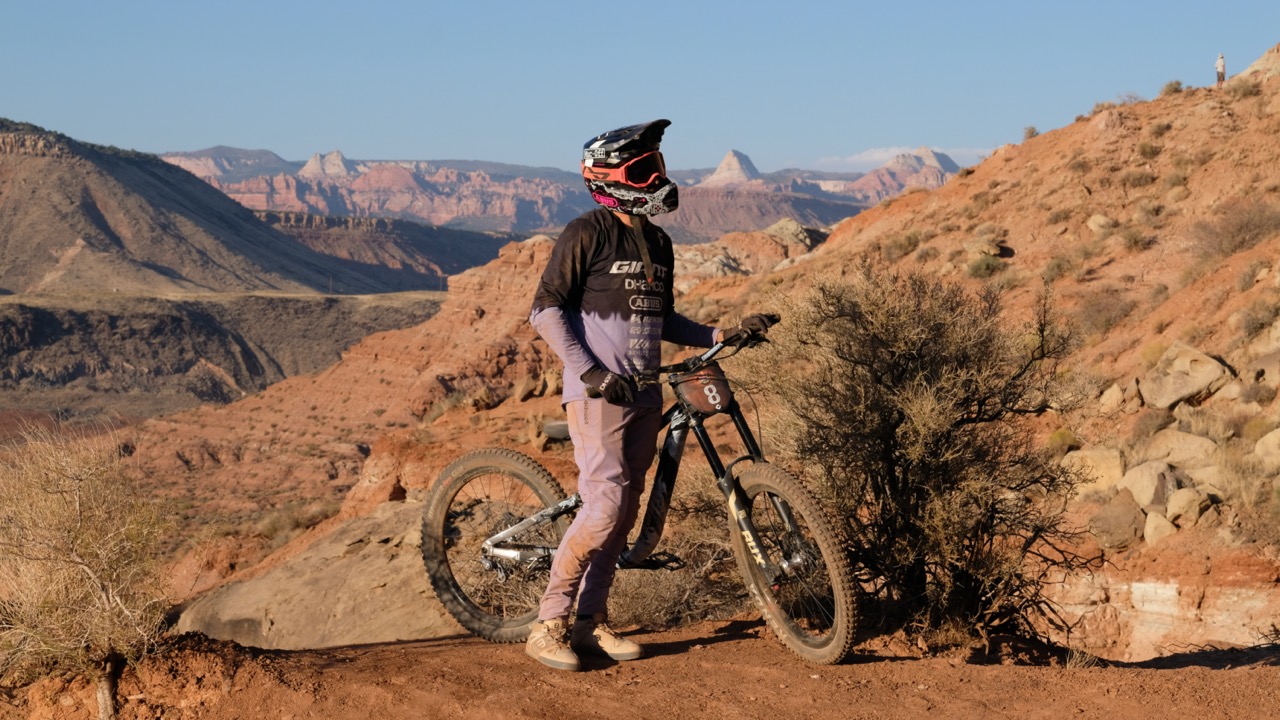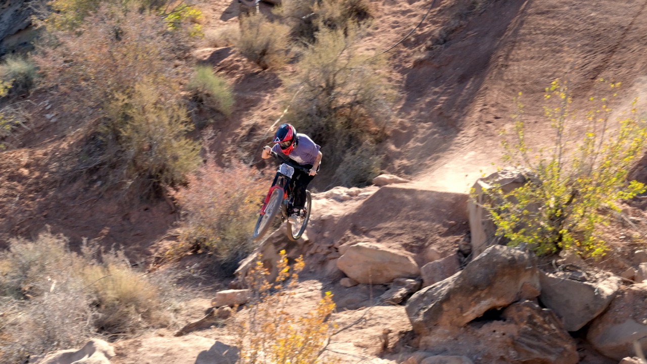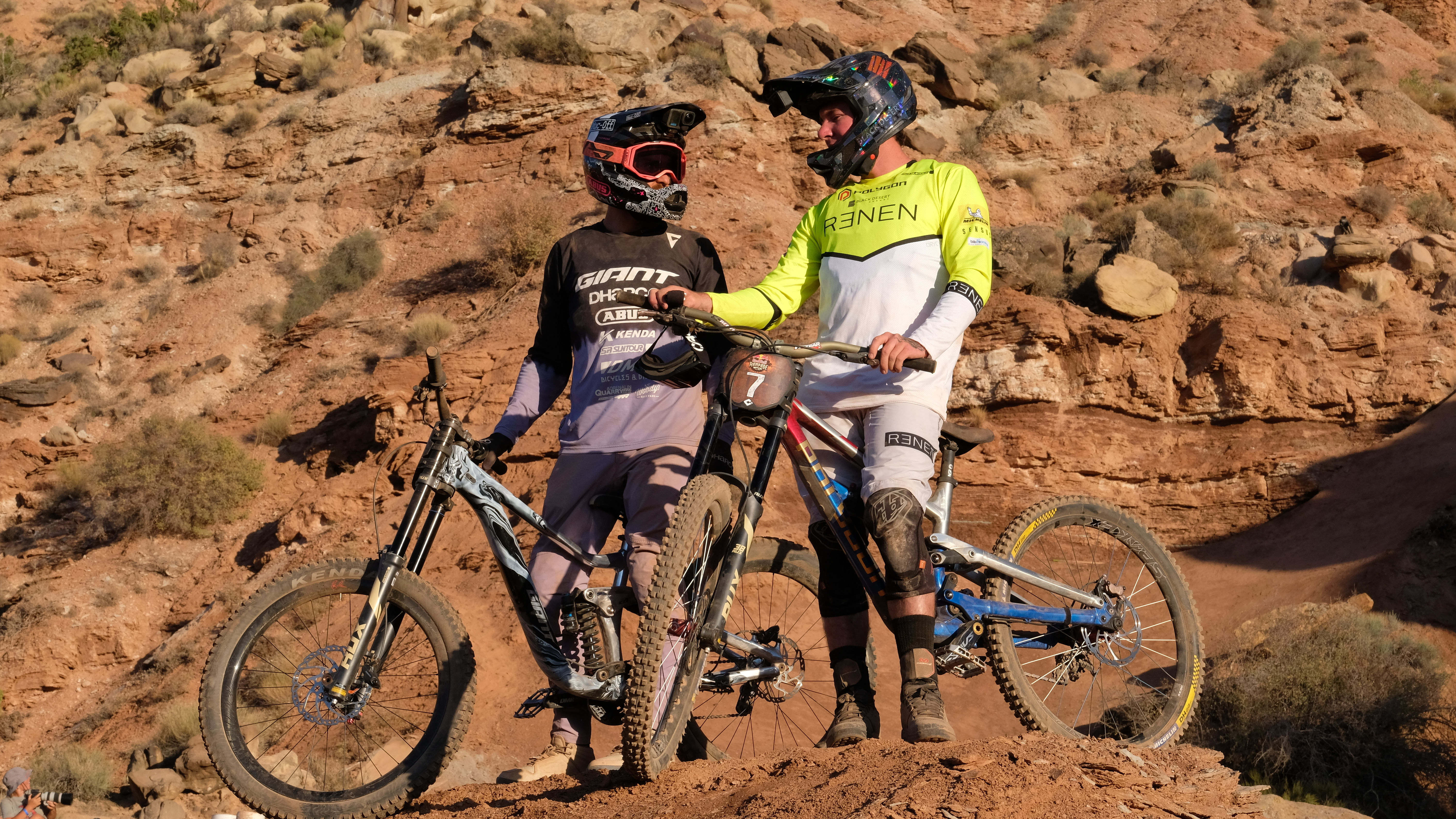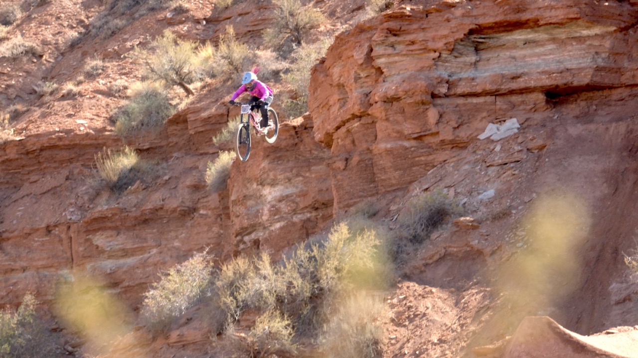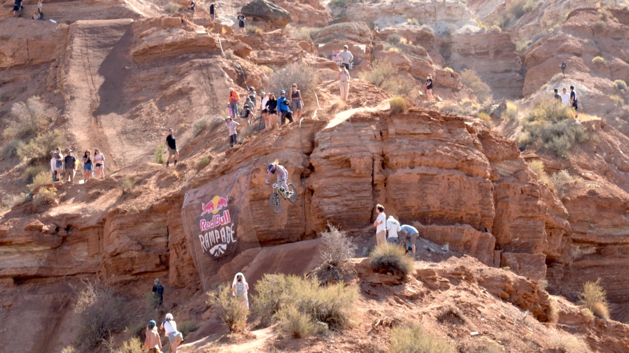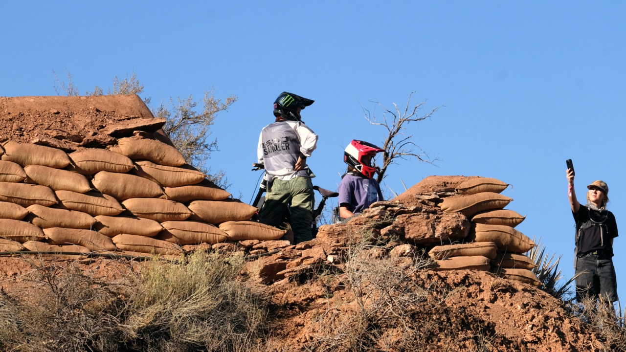 Today was the last day of practice for the women, tomorrow is showtime. But when you watch Red Bull Rampage on the TV, with all the Loud Hype Stoke production values, you’re seeing a teeny tiny tip of the iceberg. You’ve missed the days of digging, and of climbing up and down the hill on narrow tracks more suited to goats. It’s really not possible to overstate just how physically exhausting that is. Both previous days, I’ve been on site for less time than the riders (media shuttles leave long before the evening riding finishes and it’s a long hot walk out if you miss them), and while I’ve walked and climbed plenty, I’ve not been wielding a shovel. Both days, I’ve crawled into bed by 9pm, head pounding from the heat and dehydration – despite drinking many litres of electrolyte drinks. One of the diggers told me they were drinking nine litres of electrolytes per day. The sun is baking. The wind is warm. The shade is warm. Nothing is cool, never mind cold. I know I’ve said this all before, but this year is particularly hot – it hasn’t really cooled down at night. It’s against this backdrop of exertion and endurance that the riders line up to hit the last of their features and string them together.