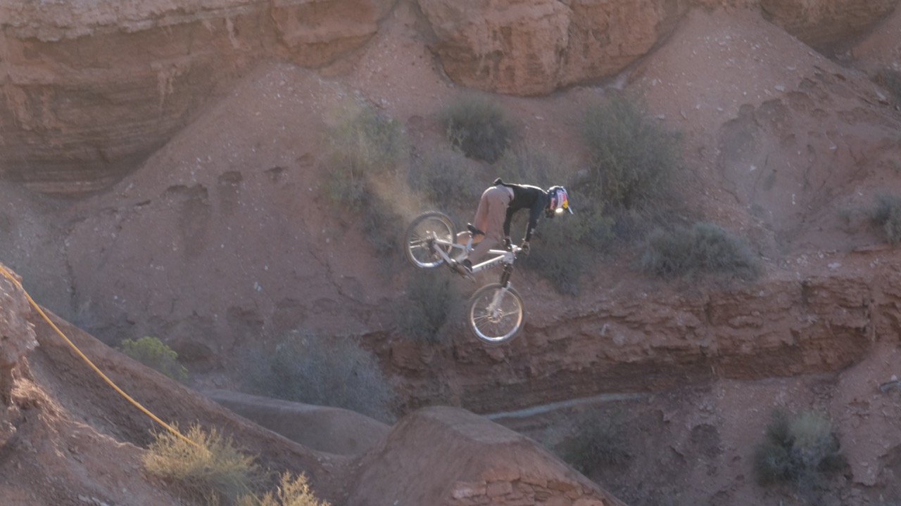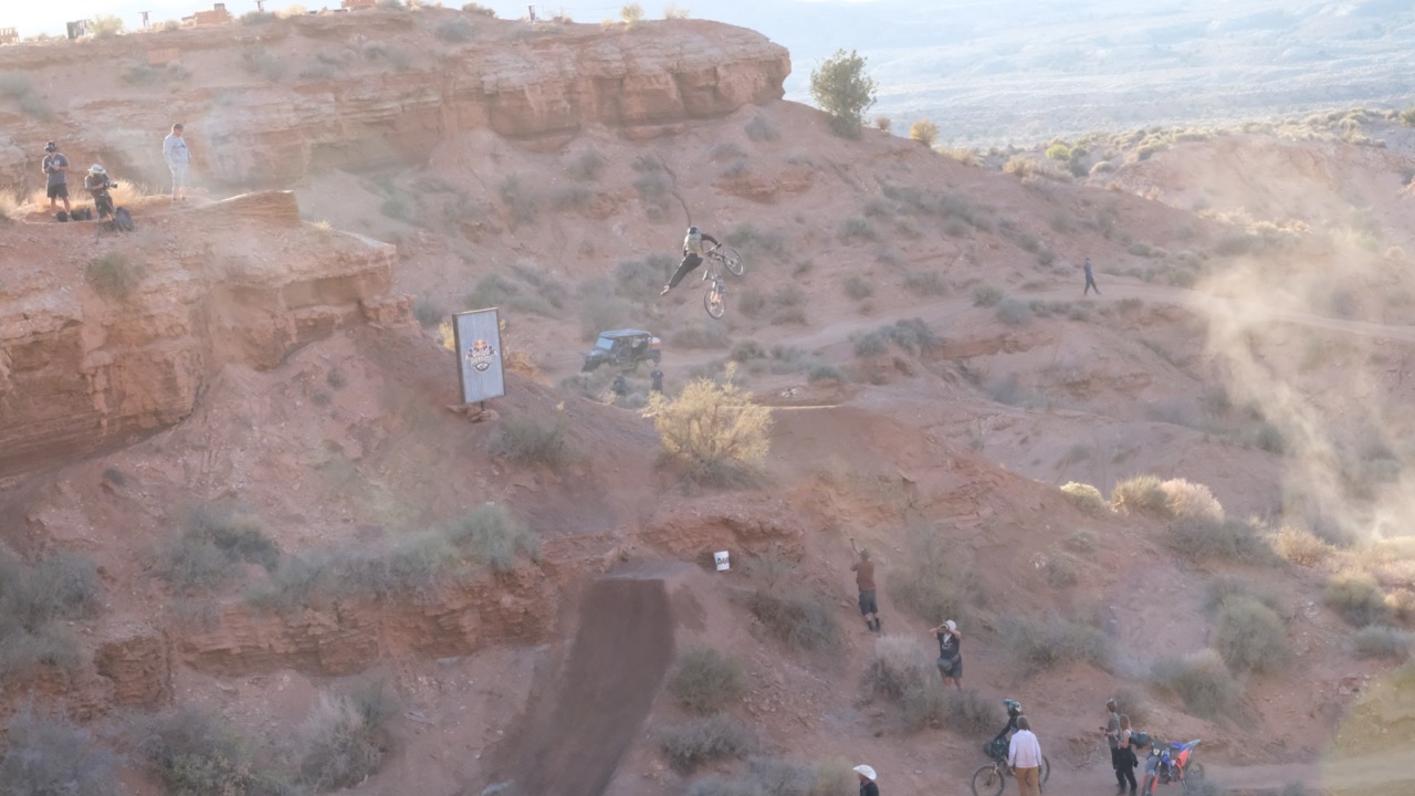 And then, at the end of the day there was a whole sequence of riders suddenly throwing tricks off the front of an absolutely massive drop and into a series of trick jumps. My jaw dropped at the sight of Kurt Sorge doing and Indian Air, and Reed Boggs doing a double back flip, and then a Sui off the even bigger drop one rock layer up in the cliff. The light was incredible too, changing from yellow glowing rays through the dust filled air, to a very flattering golden glow.