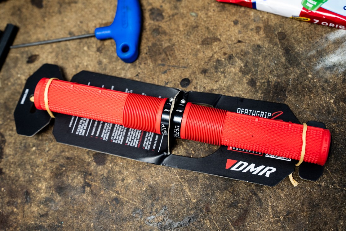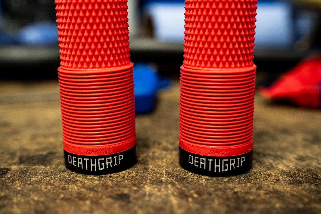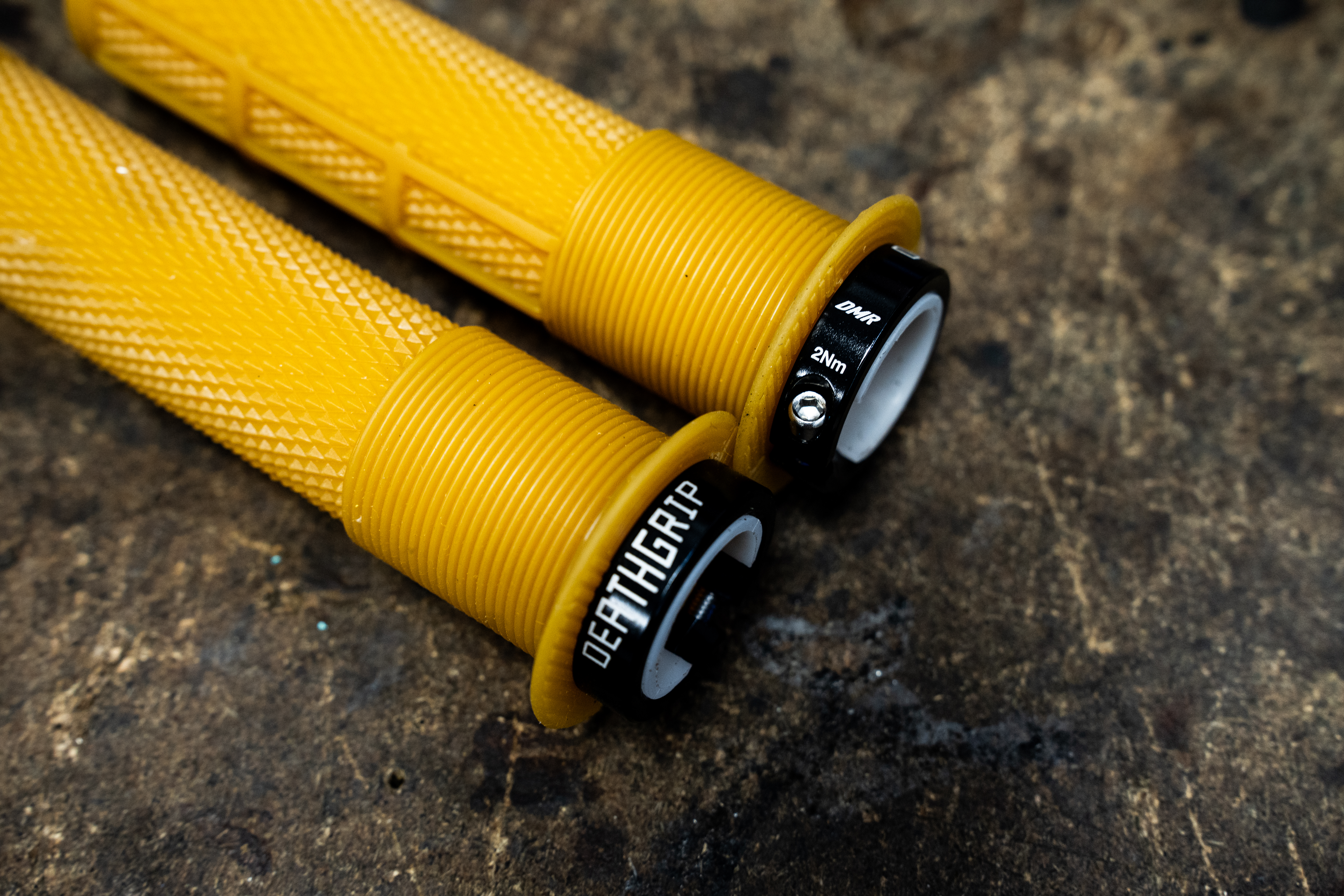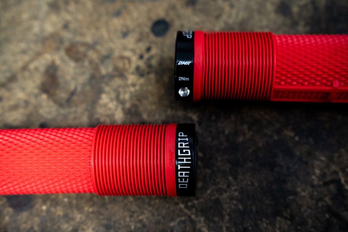 The King is dead! Long live the King! There aren’t many (any?) grips that have a cult following quite like the DMR Deathgrip. There’s now a Deathgrip 2. But don’t worry, everything you Deathgrippers like about the Mk1 is still present and correct in the new Deathgrip 2 grip. There’s still the mushroom gill thumb-forefinger zone near the inside collar. The main body of the grip is classic knurkling in full effect. And on the froint-underside there’s the raised ridged finger box zone. The lock-on collar fits over a slightly flared out core end so that it doesn’t fall off and go under the fridge-freezer. The single lock-on collar is a little bit slimmer now. At the other end of the grip the encapsulated end has been reworked so is now hard plastic integrated into the grip. They’re tapere-core sleeved, so are best installed with a soft mallet to drive them fully home. As before there’s two diameter options: 29.8,m or 313mm. And there’s three krayton rubber compound options: Soft 20a, 25a (gum only) and Super Soft Race 15a. Available in flanged or flangeless. Plenty of colour choice too.