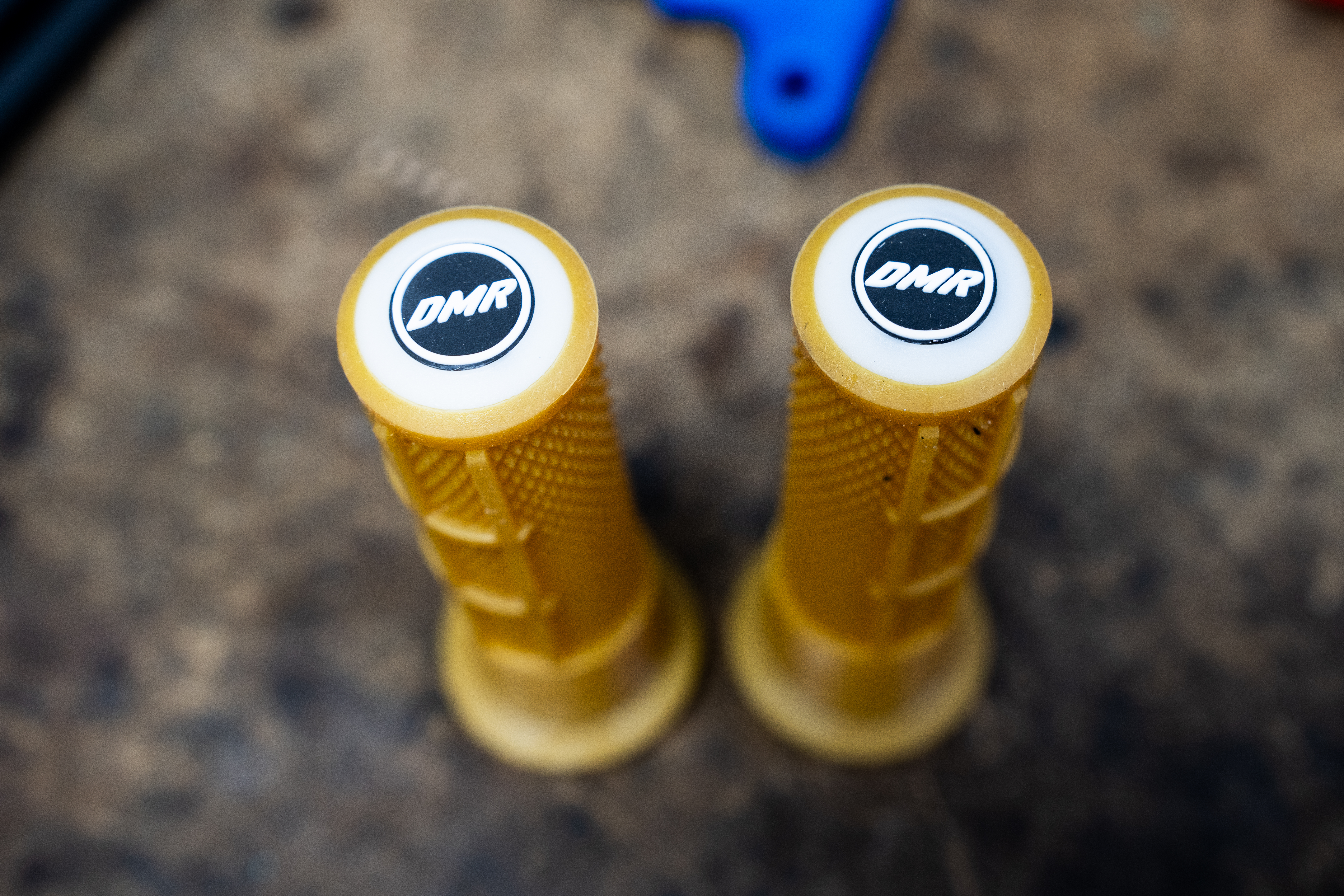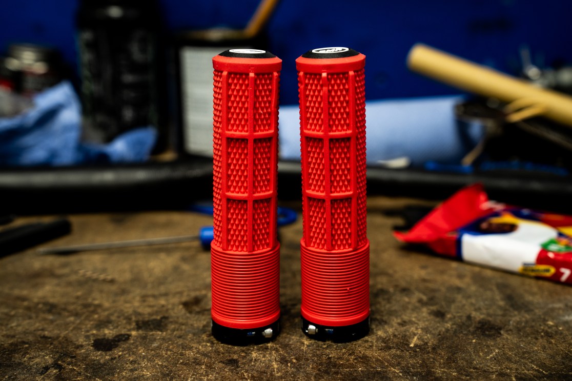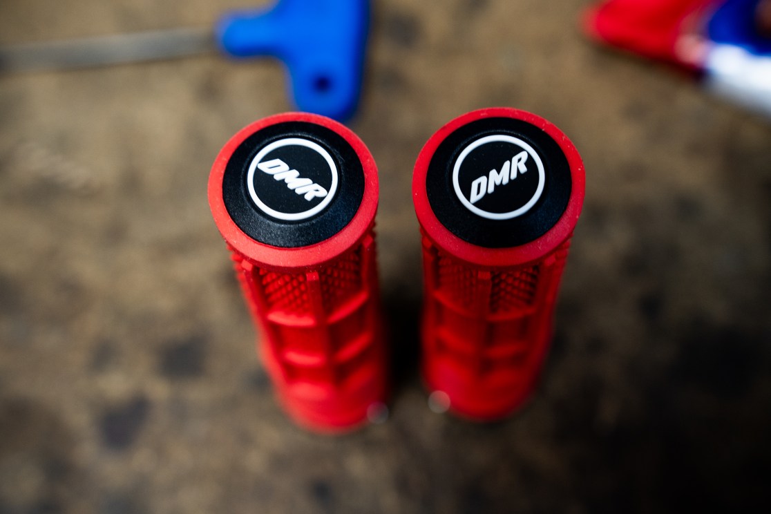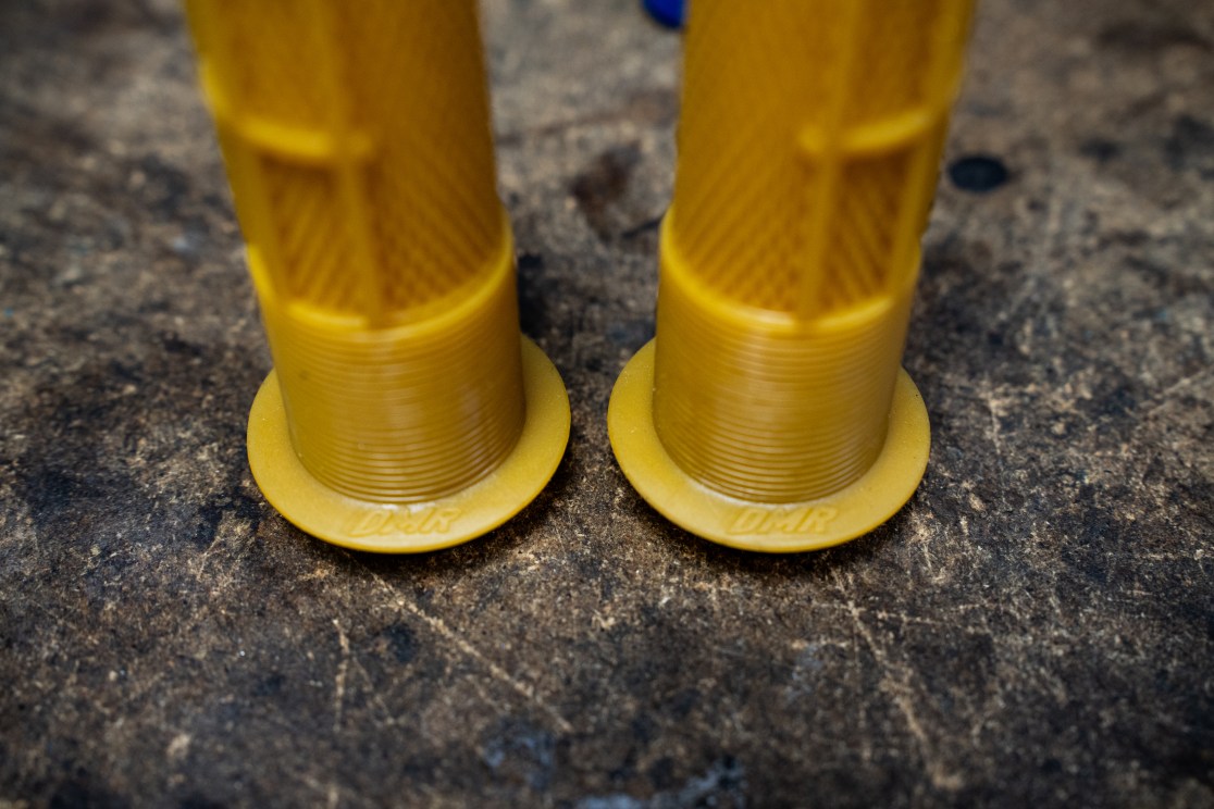 The King is dead! Long live the King! There aren’t many (any?) grips that have a cult following quite like the DMR Deathgrip. There’s now a Deathgrip 2. But don’t worry, everything you Deathgrippers like about the Mk1 is still present and correct in the new Deathgrip 2 grip. There’s still the mushroom gill thumb-forefinger zone near the inside collar. The main body of the grip is classic knurkling in full effect. And on the froint-underside there’s the raised ridged finger box zone. The lock-on collar fits over a slightly flared out core end so that it doesn’t fall off and go under the fridge-freezer. The single lock-on collar is a little bit slimmer now. At the other end of the grip the encapsulated end has been reworked so is now hard plastic integrated into the grip. They’re tapere-core sleeved, so are best installed with a soft mallet to drive them fully home. As before there’s two diameter options: 29.8,m or 313mm. And there’s three krayton rubber compound options: Soft 20a, 25a (gum only) and Super Soft Race 15a. Available in flanged or flangeless. Plenty of colour choice too.