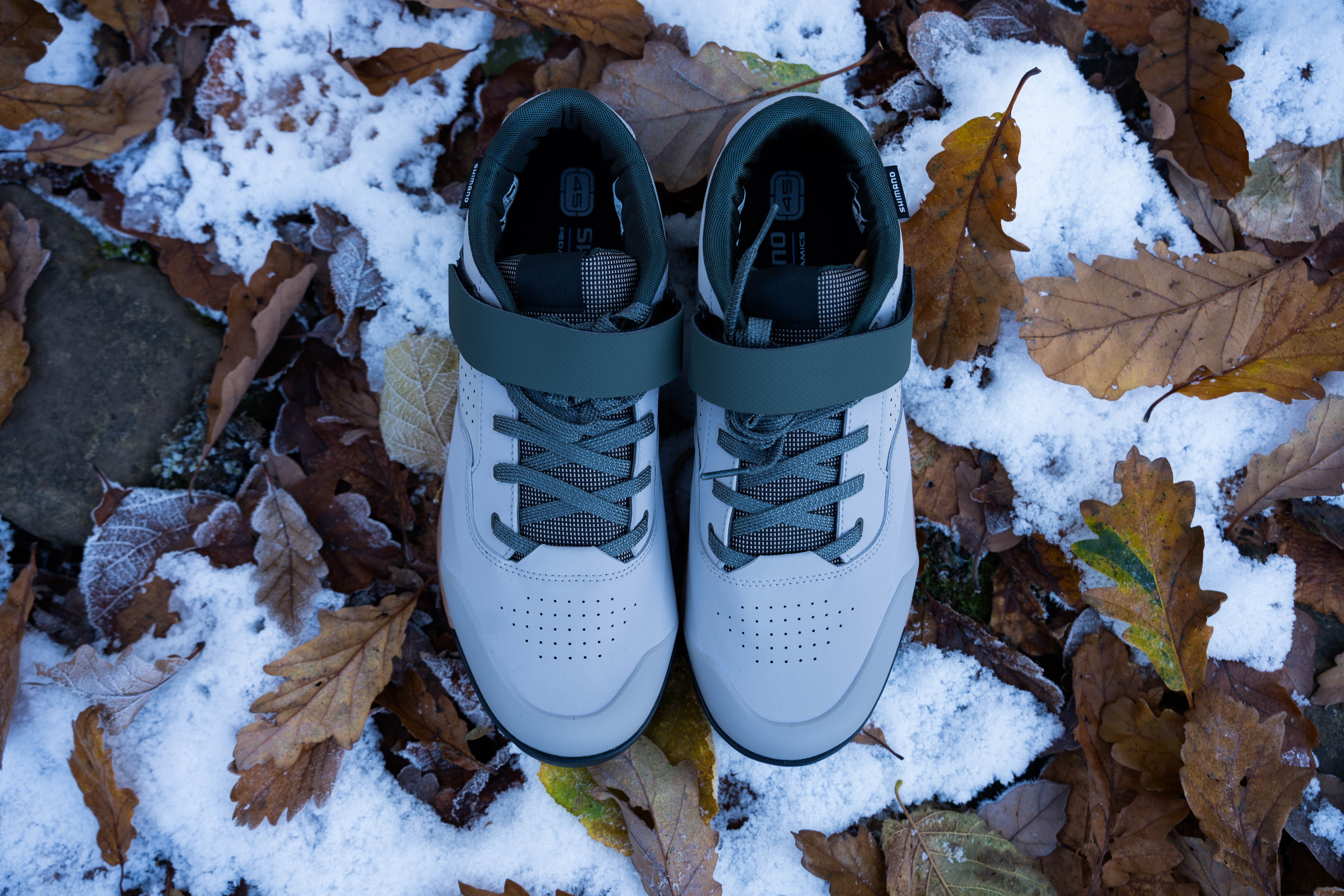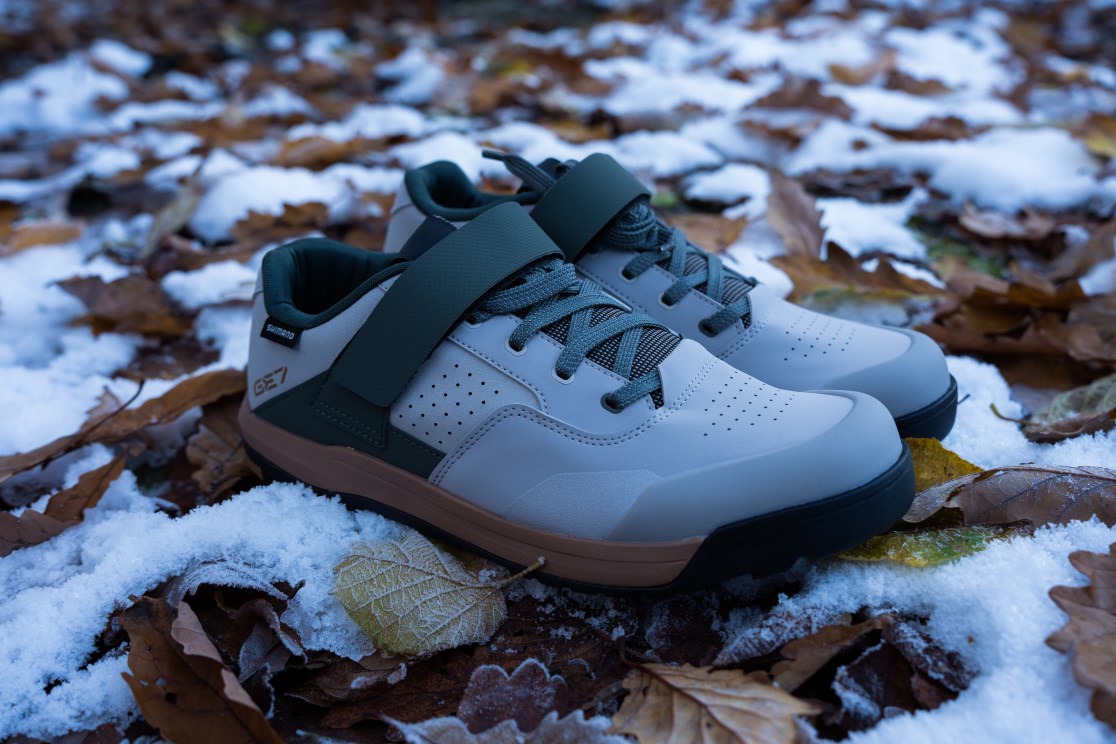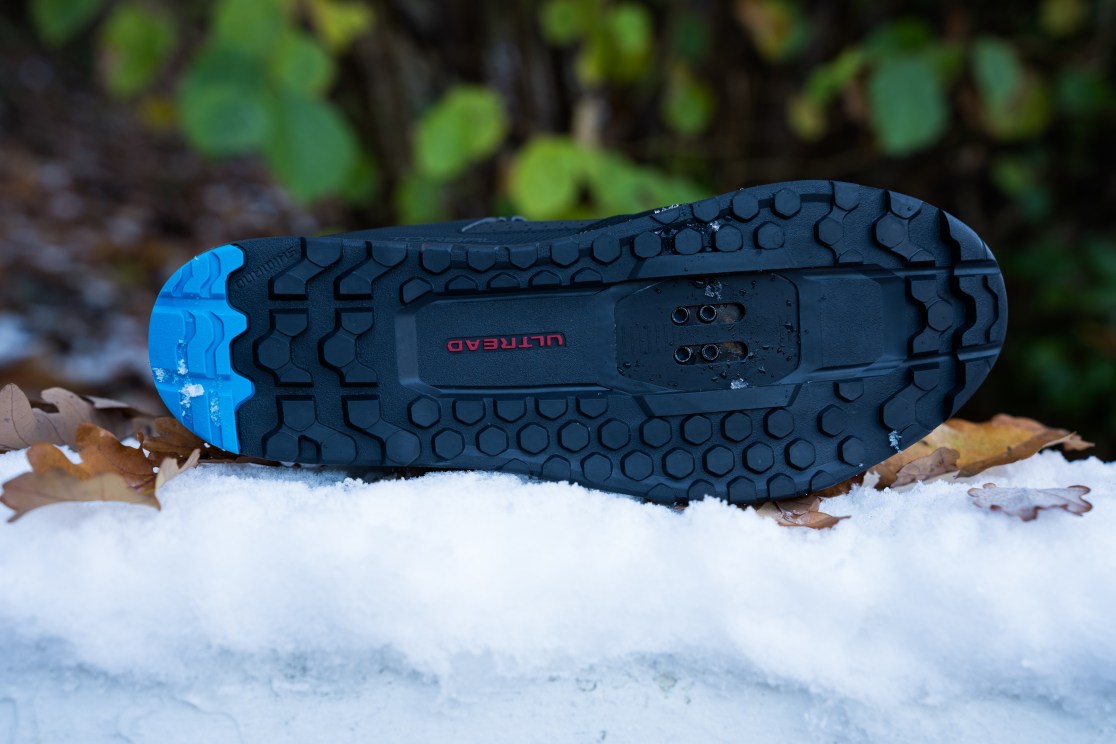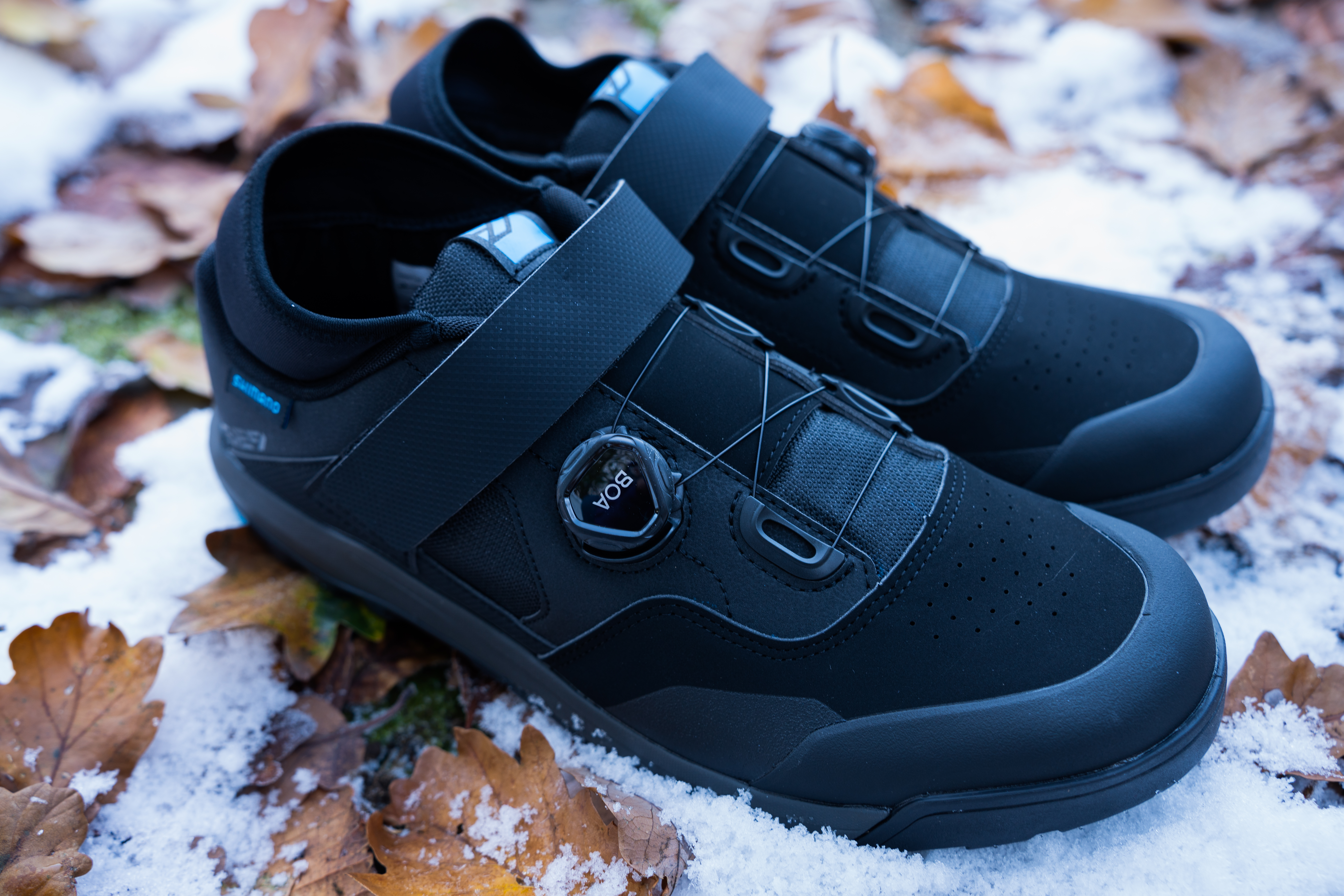 Enduro clippy-sneakers. Featuring Shimano’s genuinely grippy ULTREAD GE rubber compound (which hasn’t really had enough praise in our opinion). The cleat box ‘n’ slots is further back these days so you can place your foot more centred over the pedal axle (if you want to). What else? Updated pedal channel has an expanded toe-to-heel design for improved security when you’re flailing around unclipped. EVA foam midsole. Laces and a big ol’ instep strap. Asymmetric padded ankle collar and reinforced toe cap.