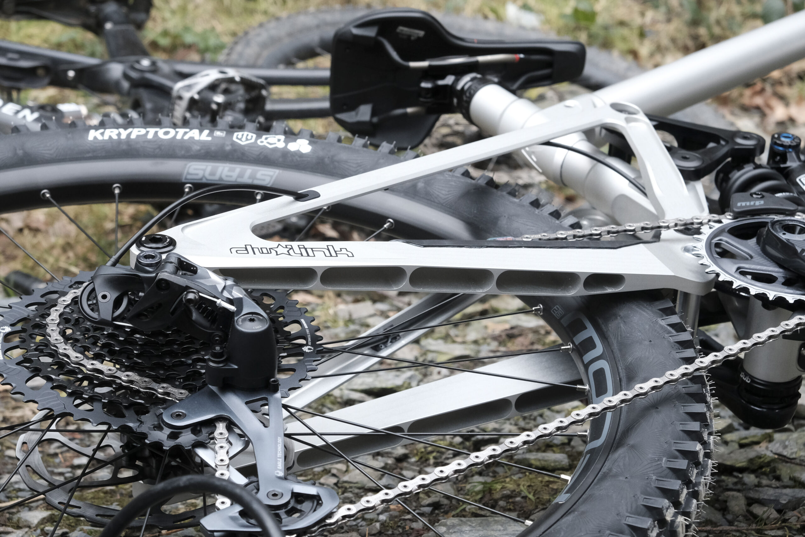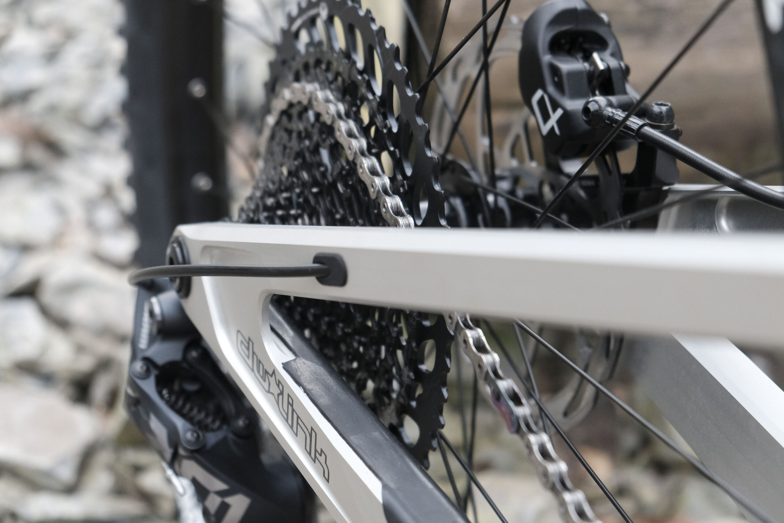 The rear triangle is machined in two halves with the seat stays adopting an L-section and the chain stays machined in an inverted U-section. From the side and back of the bike they look like square tubes; it’s only when you get close you can see the exquisite machining. It’s all logically designed for the inevitable Welsh mud to fall out of, not into these frame pockets.