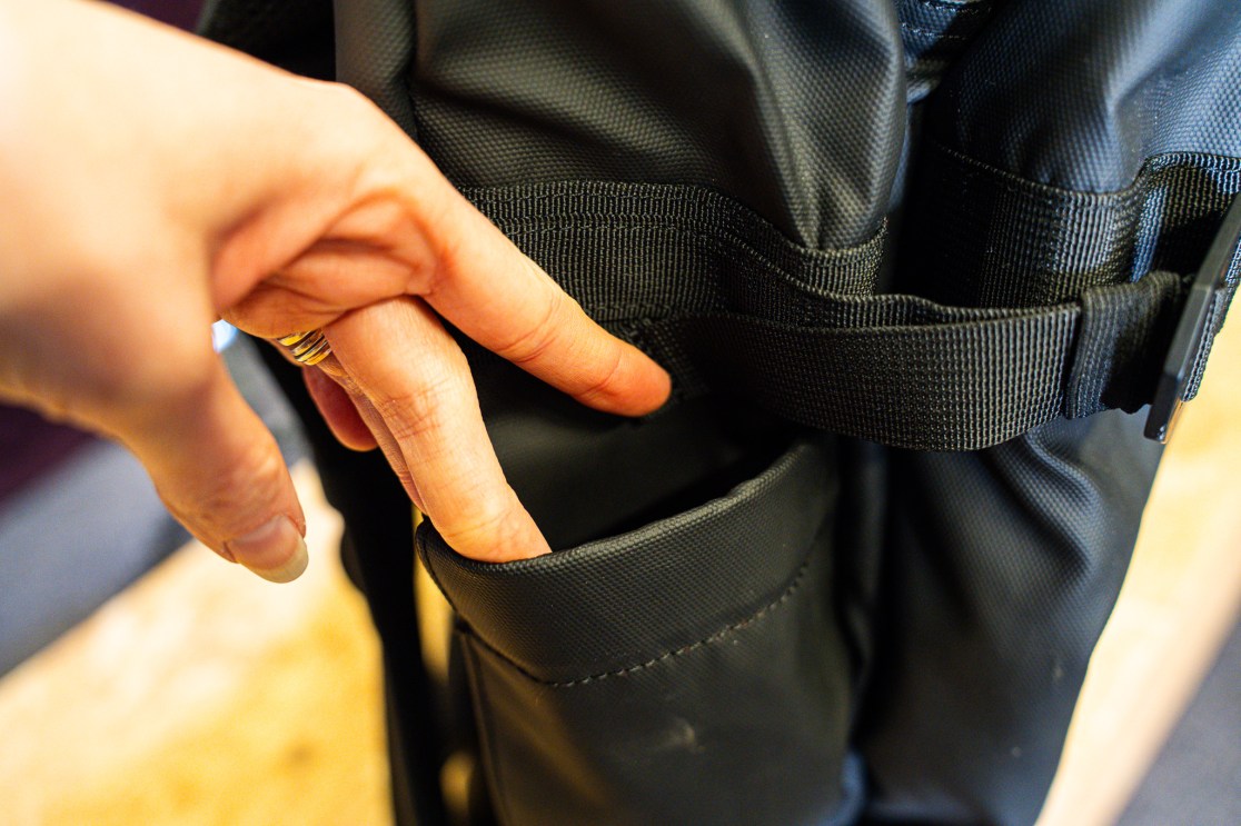 At the back of the pack, behind the rucksack straps, is a lightly padded laptop sleeve that runs the full height of the pack, so even a large laptop should fit. There’s also a secure zipped pocket that sits up against your back, hidden behind the backpack padding – no pick pockets are getting in there while you’re carrying it. On the outside is a pocket with elasticated top suitable for stuffing a water bottle into – something I’ve often wished my Allpa had. This pocket does work, but it is rather snug – something a little easier to access when the pack is on your back would be even better. On the very front of the bag is another zipped pocket for quick access to items – though note that it has no security option.
