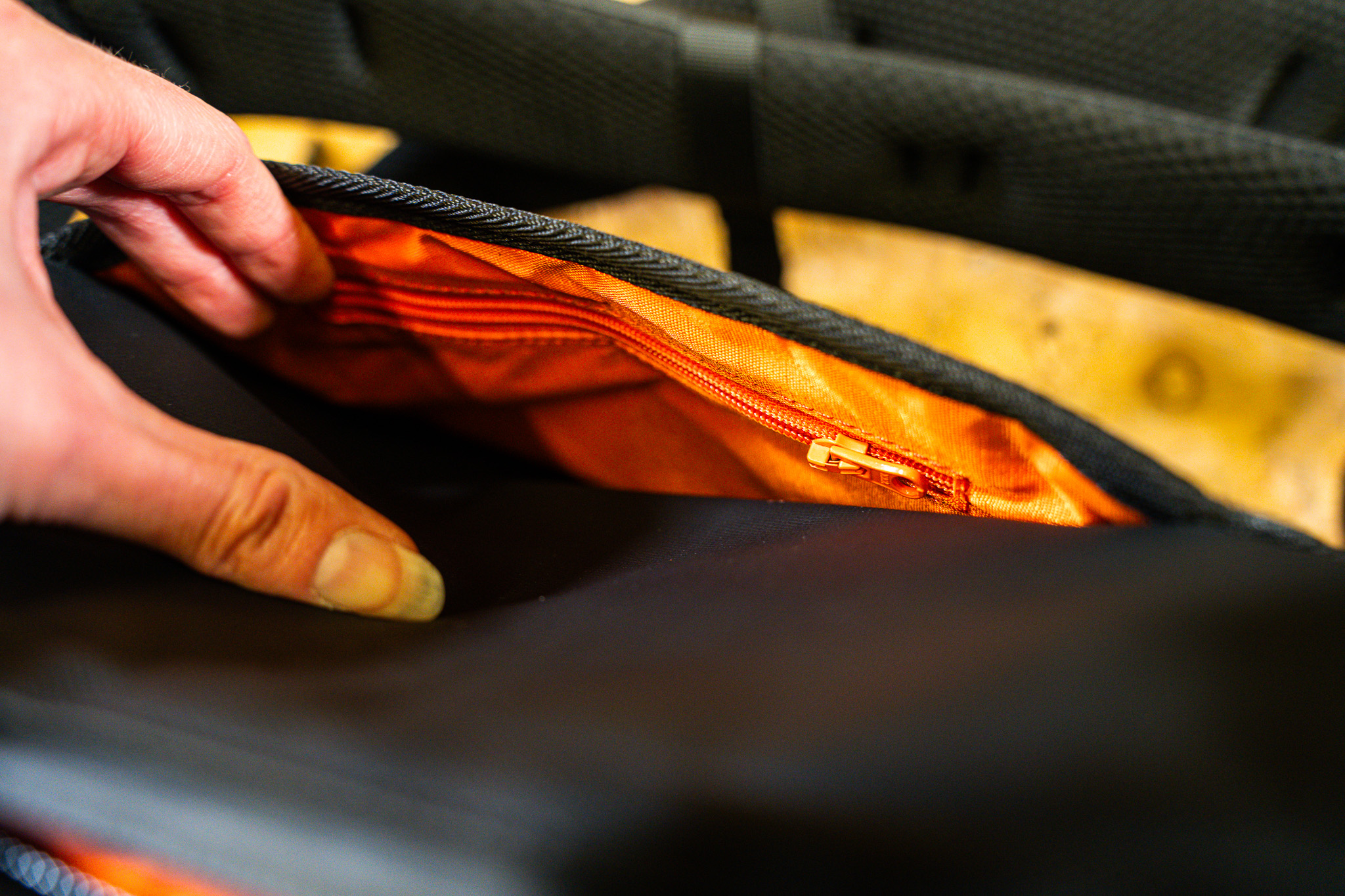 The external fabric is tough and waterproof – there’s no need for an extra rain cover unless it’s really chucking it down, and there’s a cover tucked away in a bottom pocket for that purpose. The external zips are waterproof, and the big zip for the clamshell has loops so you can fit a padlock. There’s even a handle on the top and sides for quickly grabbing your pack, or clipping a few extra bits onto.
