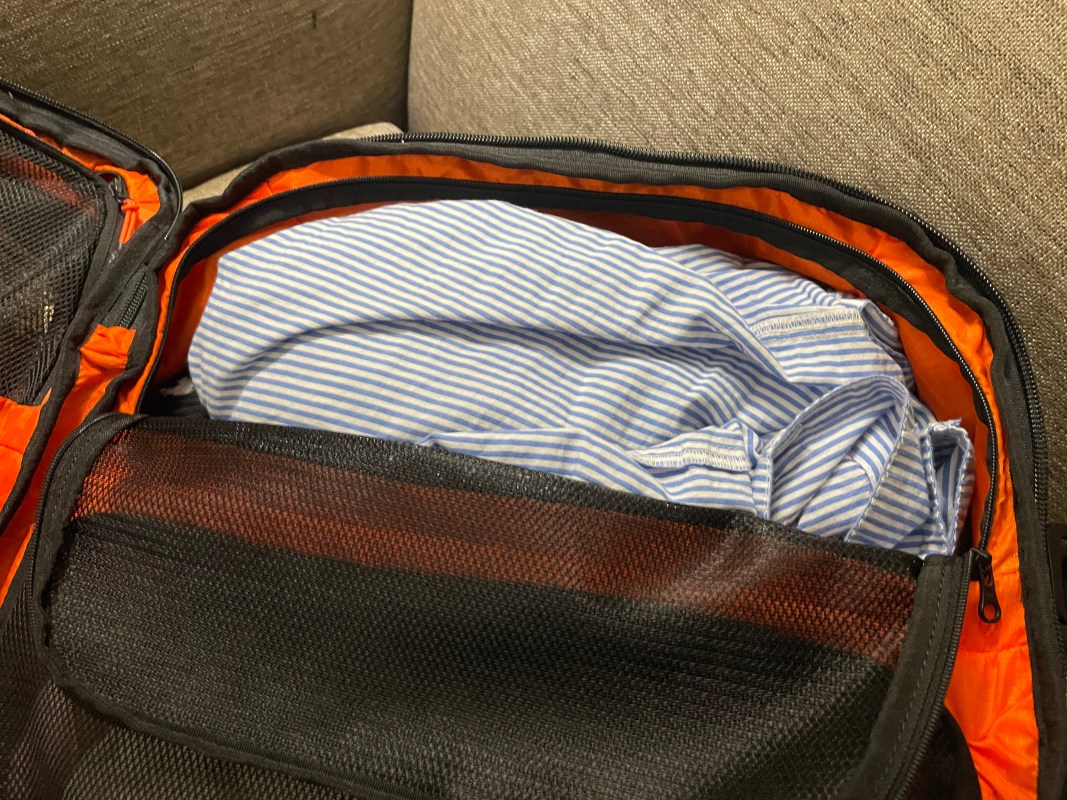 Inside, the pack has a bright orange lining, making it easier to see your belongings against the background. Zipped covers hold your items into the different areas of the clam shell. The right hand side of the pack is divided into three sections, the bottom one being just right for a pair of shoes and has a solid fabric cover instead of a mesh one – so if your shoes are a touch muddy or dusty it won’t get everywhere. The left side has one larger square section, and an upper section that’s also accessible from the outside of the pack. There’s an extra small secure pocket in the upper pouch too. While the layout is similar to the Allpa, there are more divisions here – so if you really want to haul larger items around, the Allpa might be a better choice for you. I’d like to see the divisions here in the Adventure Bag being optional – so you could make it into a larger space if needed.