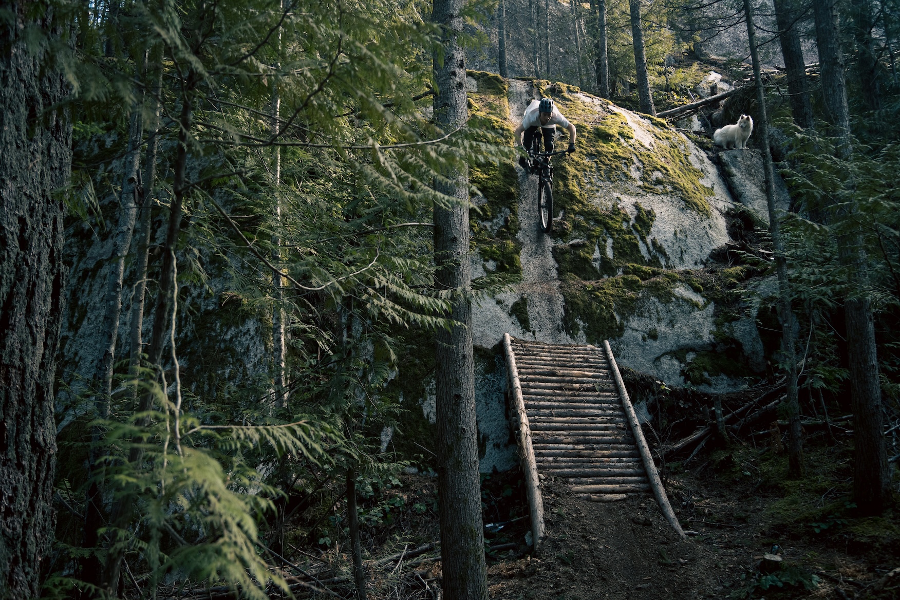 “This Photo was taken in the Valleycliffe area of Squamish, BC (my hometown) the feature/trail was built by a local trailbuilder and rider Matt Bolton.The dog is a sweet Samoyed called Maya and this was one of her last trips out as a trail dog with friends, she loved joining us on the trails biking but she’s getting a bit older now and enjoys smaller walks and treats. I wanted to get her one last great shot out on the trails and I knew this freeride area with interesting builds was a great location to showcase her as a grounded loyal companion watching her humans do crazy things.”