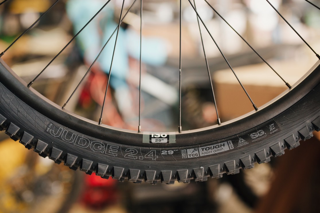 The specific tyre we’ve been testing is the WTB Judge 29 x 2.4in TCS Tough High Grip TriTec SG1 IP+. Not that you’d know all of that bumf from the sidewalls of our embargo edition tyres; you can barely make out the ‘WTB’ lettering (see pic above).