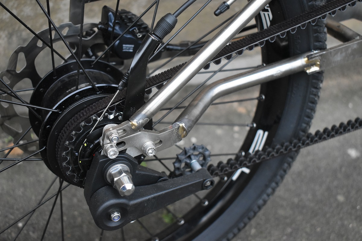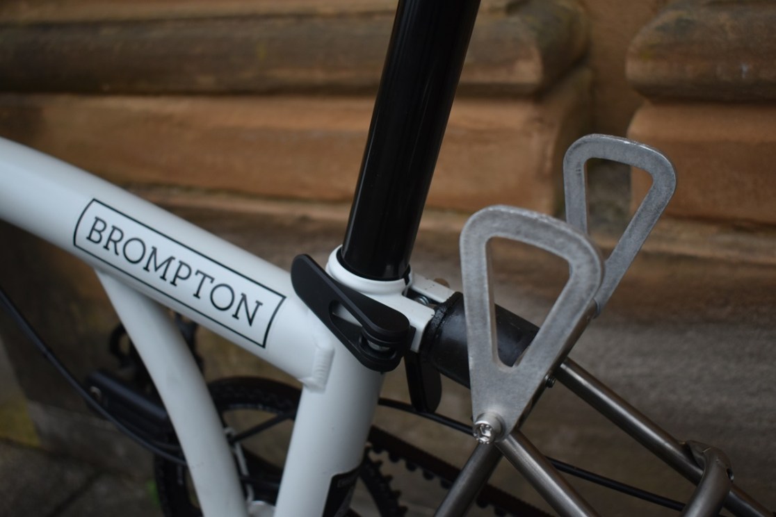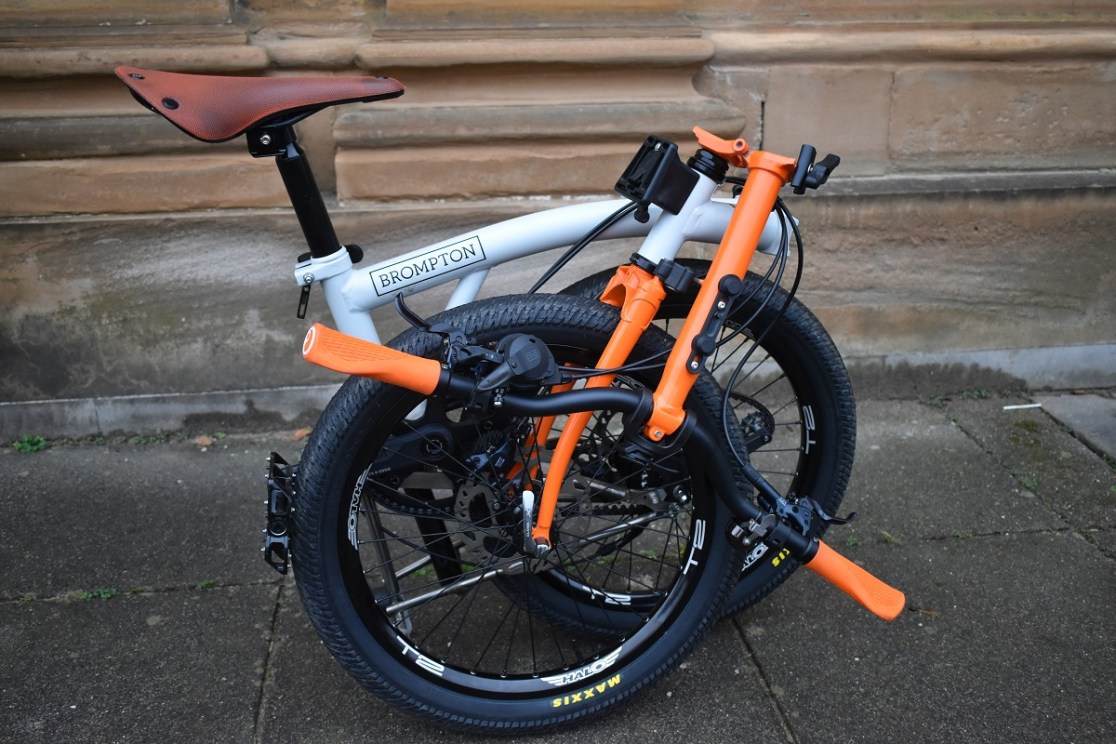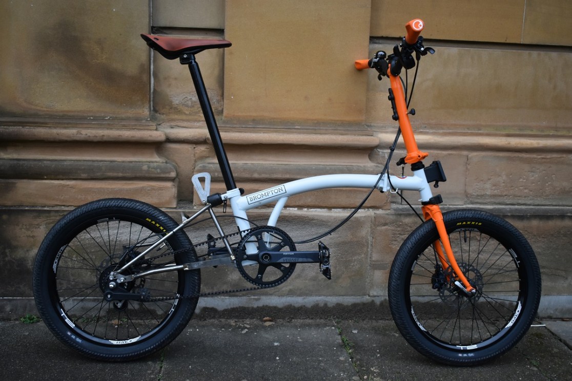 Brompton may just have launched their 20 inch G Line series but Ben Cooper of Kinetics in Glasgow has been building custom Brompton conversions for years. This particularly beautiful example is a custom build for forum regular, Myheadsashed, who has quite the eye when it comes to cool looking bikes. A no expense spared example of what Ben can do, this 20inch wheeled number features an 11 speed Shimano Alfine hub with J-Tec shifter, Gates Carbon Belt Drive, Rotor Vega ST cranks, MKS Always pedals, custom stainless steel back end, Halo T2 rims, Shimano SLX disc brakes, Fidlock bottle mount, Brooks Cambium saddle, colour matched Ergon grips and a pair of NOS Dialled Bikes Pablo Esco Bars. Gotta love a pun.