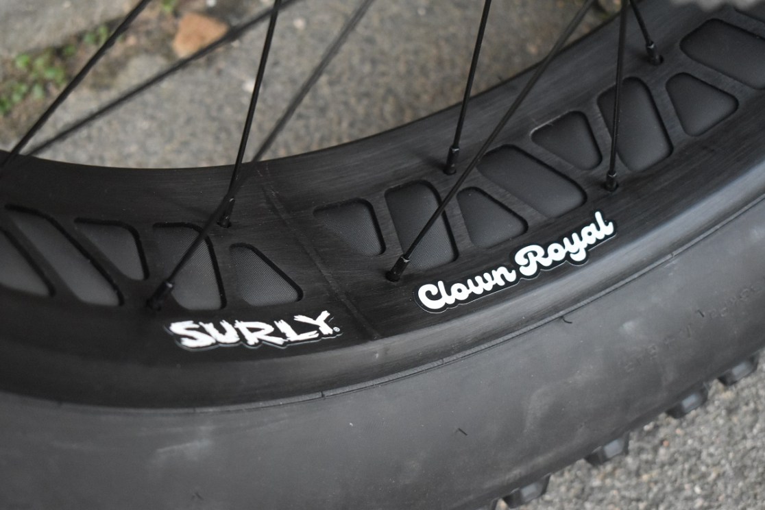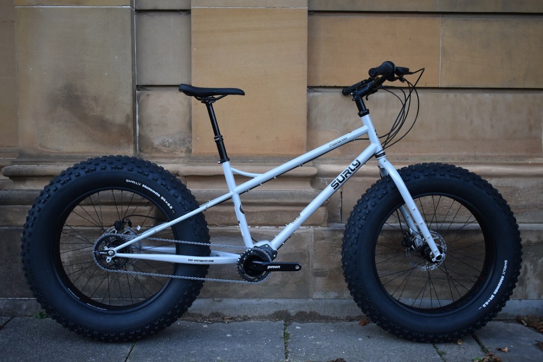 If you know, you know. If you have ever wondered just how fat a fat bike can get, Surly have your answer. Very! When Surly launched the original Moonlander over a decade ago, it made folk stop and stare. It was a fat bike on steroids and built up a loyal following of riders. Never one to rest on their laurels, Surly have turned the dial up to eleven and beyond with the second generation model. Everything about it screams more. Starting with a mid-tail design in order to accommodate the quite frankly enormous 6.2 inch tyres on 24 inch 100mm wide Surly Clown Royal rims, Surly have upped the ante with the inclusion of a 9 speed Pinion gearbox. Featuring a 197mm rear AND front hub spacing, you could, if you were so inclined, run different sized rear cogs, depending on where and when you were riding. Want to go traditional 26 inch wheel on a skinny 4.8 inch tyre? Heck, you can do that too. This particular model is one of only ten to have landed here in the UK but our resident fat bike fanboy, Sanny, managed to persuade Andy and Pat at the distributors, Ison Distribution, to let him have one as a test bike for the next couple of months. Early reports from him suggest that it is a hoot to ride, that it handles very similarly to his own Surly Ice Cream Truck and that its rides and feels a lot lighter than you might expect from looking at it. He has a couple of silly off grid adventures planned for it which you can read about when we publish his review and is already trying to figure out if he could sneak it in under the radar as a post review purchase. The answer is probably not……….but one can dream.