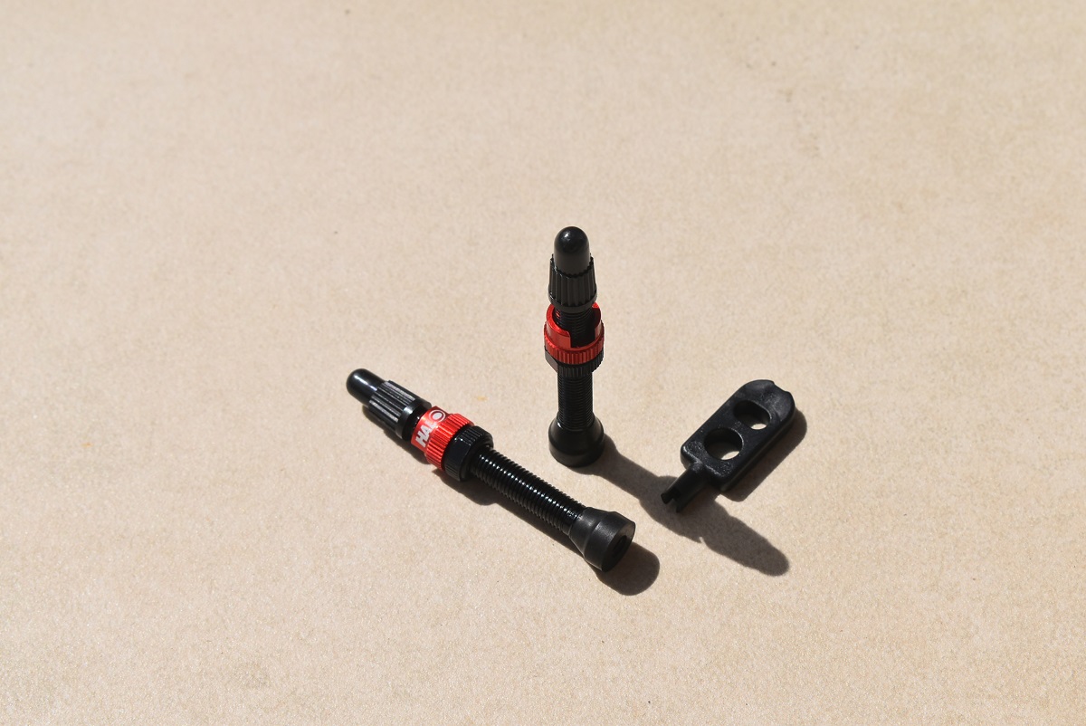 Coming in a range of five sizes from 34mm to 100mm, these removable valve core tubeless valves from Halo come supplied with three core removal tools – one red anodised one that can be stored on each valve like a lock ring and a neat little one for your home workshop.