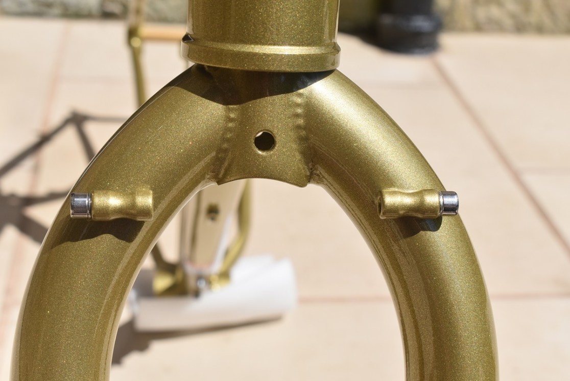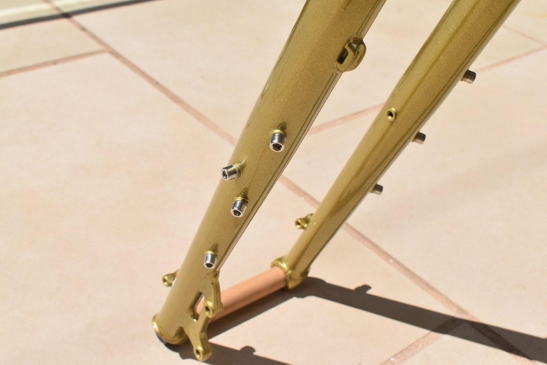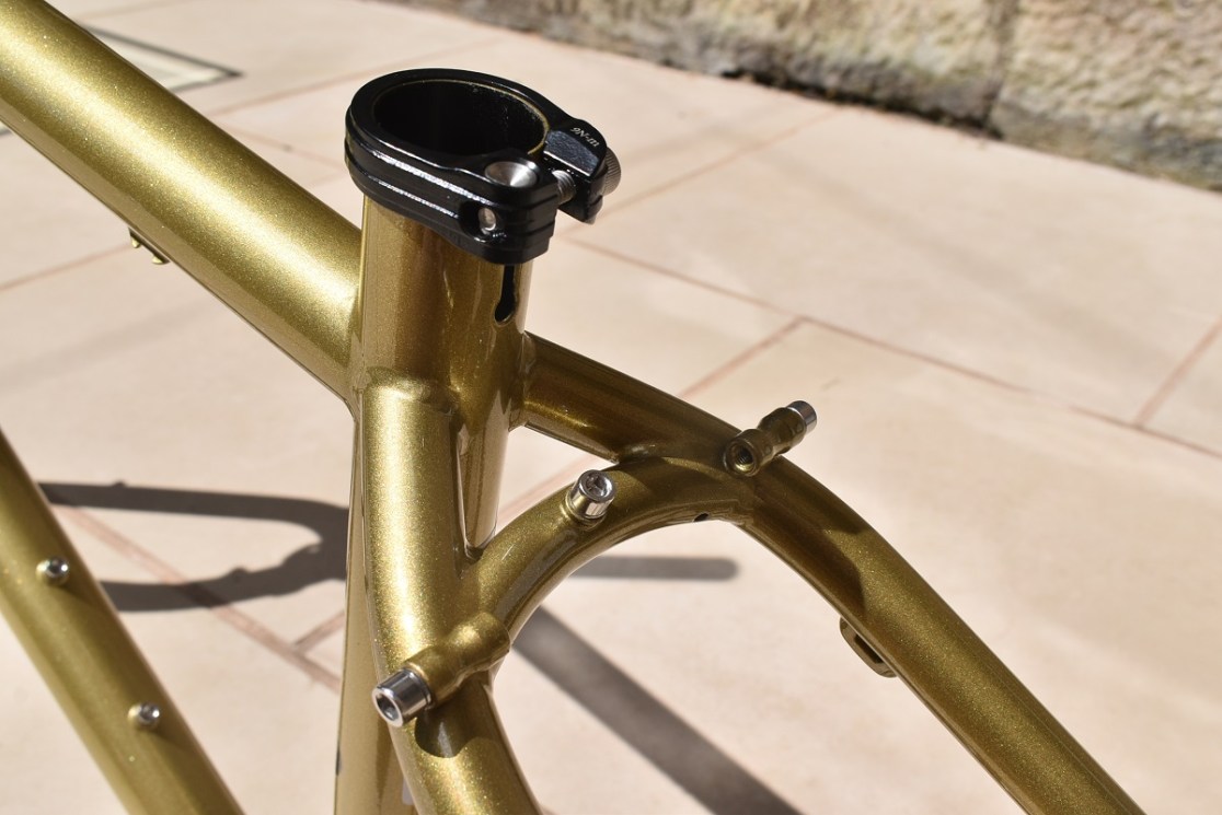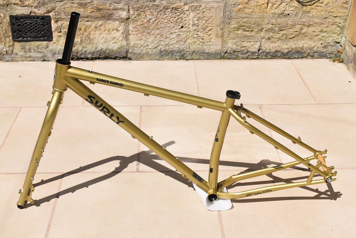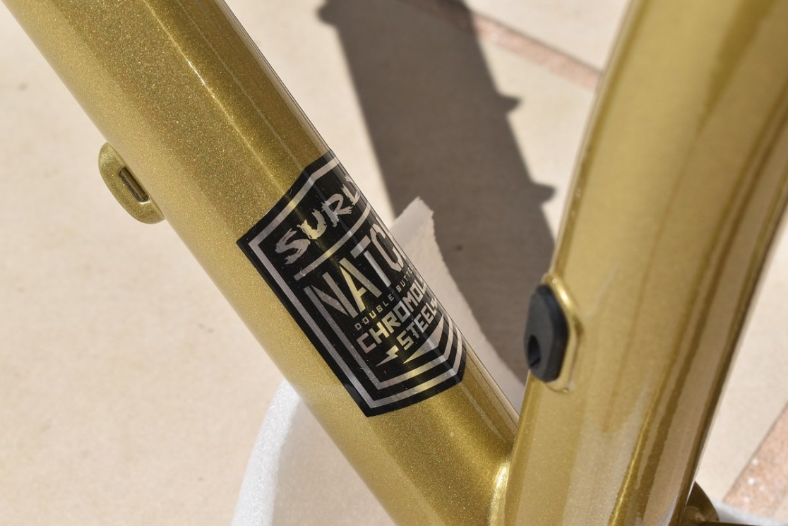 Coming in this gorgeous Fools Gold, Surly’s venerable 4130 Cro-mo frameset is destined to be Sanny’s daughter’s (Julia) new bike. Designed with versatility in mind, it can accommodate 3 inch 27.5 tyres or 2.5 inch 29er tyres. With a suspension corrected rigid fork featuring a 110mm spacing, dropper post compatibility, 44mm head tube, a gazillion bosses and a Gnot-Boost rear end that can take a 142mm or 148mm hub, it is a mighty machine. For those who still love their front mechs, it can take one with ease too.