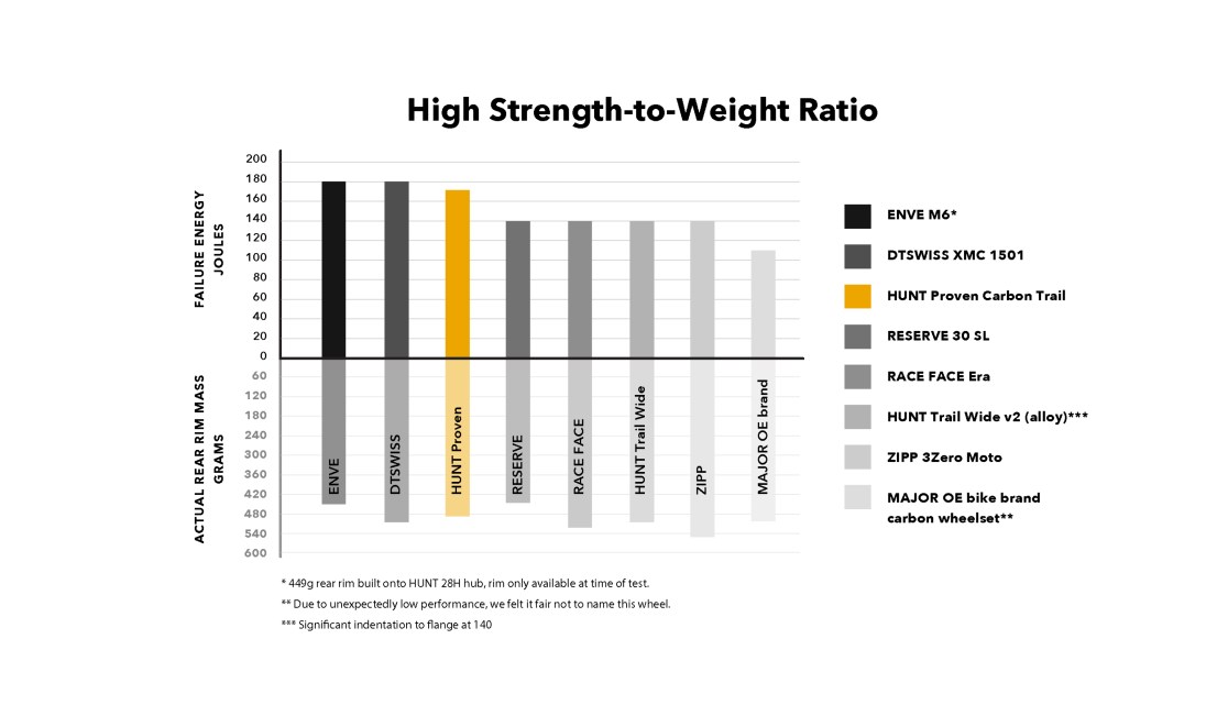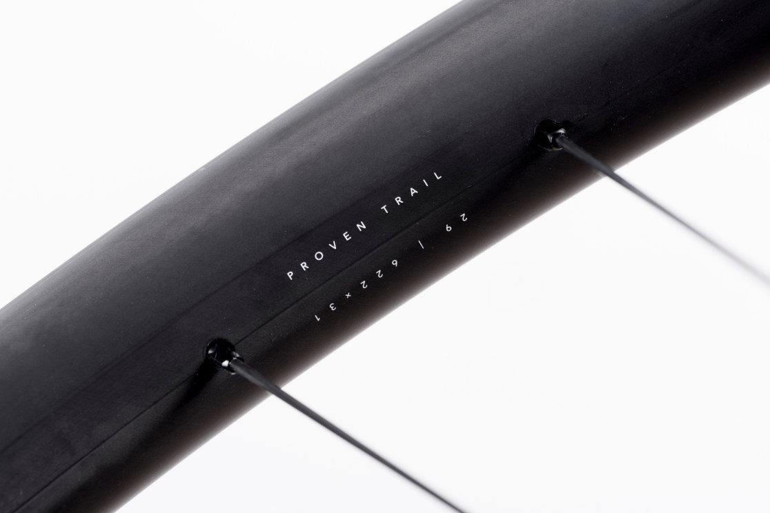 HUNT’s new Proven Carbon Trail wheelset with H_Core Rim Reinforcement Technology. Pultruded, carbon-dense H_Core inserts offer high impact resistance without high weight.