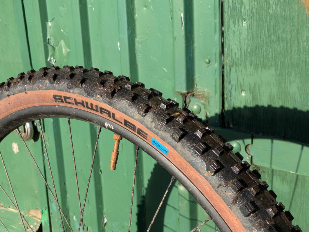 In the case of our Calibre Bossnut, we’re currently running a pair of very condition-specific tyres (a pair of super skinny mud slicing Schwalbe Dirty Dans that you can ignore for now!). The tyres the Bossnut came with were actually perfectly good for British Summer Time. But the shallow tread rear in particular was a bit of a handful.