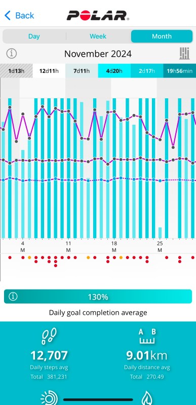 Synching to a phone was most reliable when instigated in the app on the phone rather than at the watch end of things. I spent a time using the watch with an iPhone 12 mini, which proved a lot less keen on synching than a slightly more modern iPhone 12. If you’re an old phone user, you might find this frustrating. Once in the app, you can get a closer analysis of your activities, or look at weekly and monthly patterns – with a choice of display options.