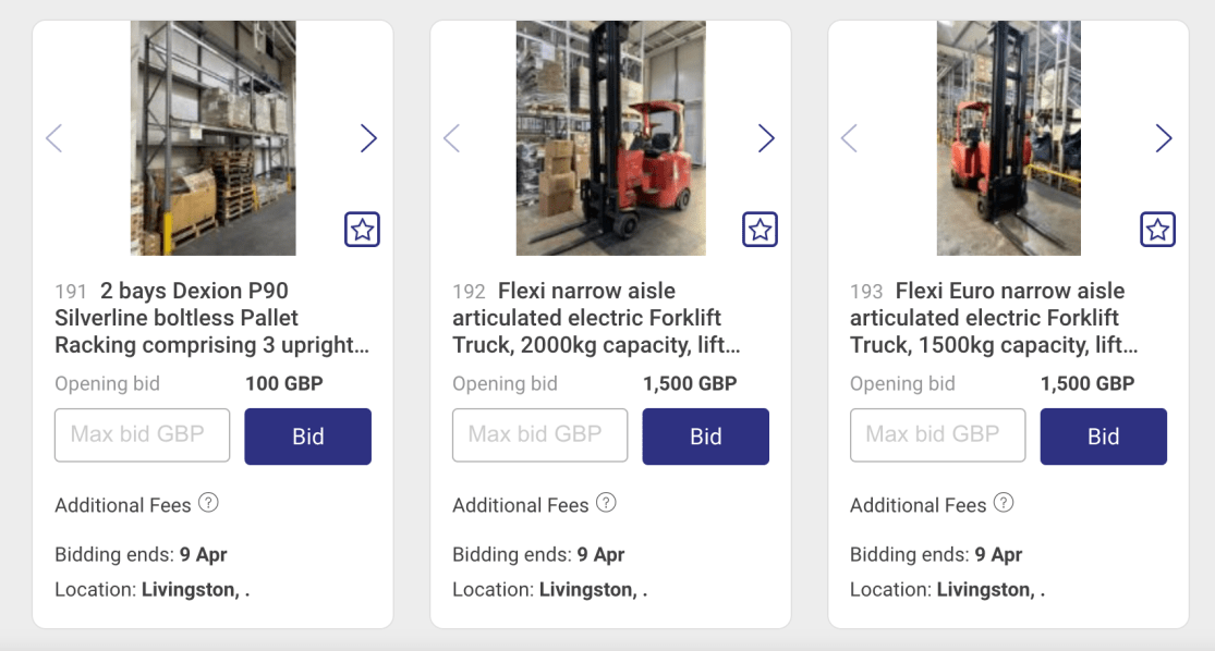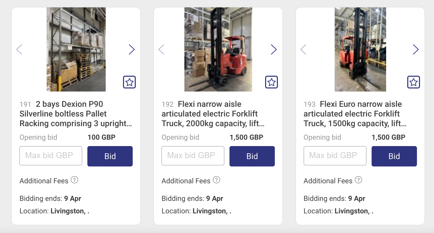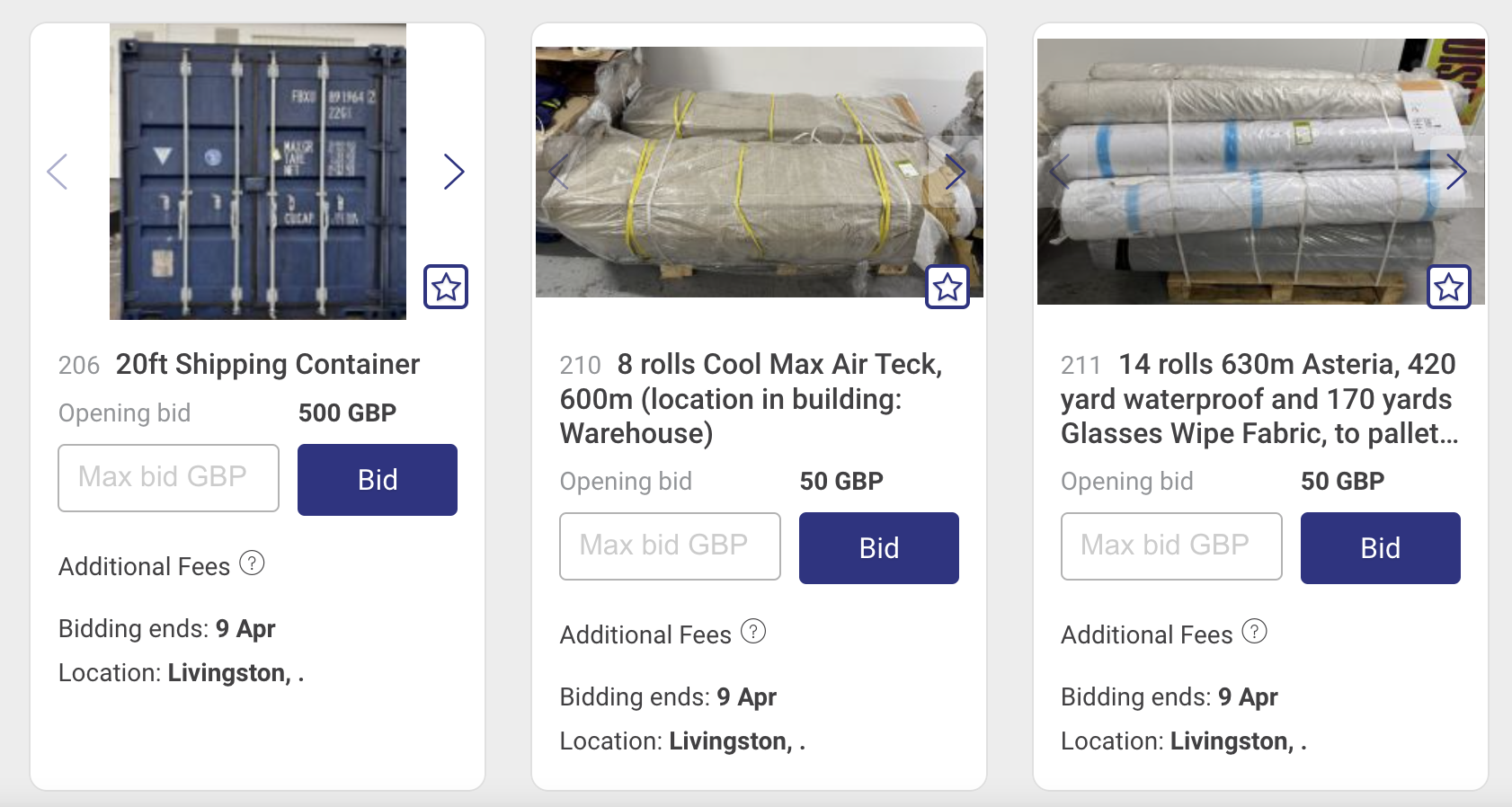 The auction site listing shows a whole array of equipment – quite the operation. There’s everything from work tables, rolls of fabric and sewing machines through to industrial racking, forklift trucks, and shipping containers.