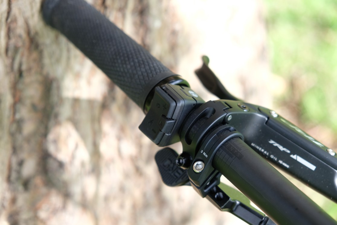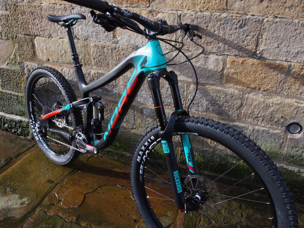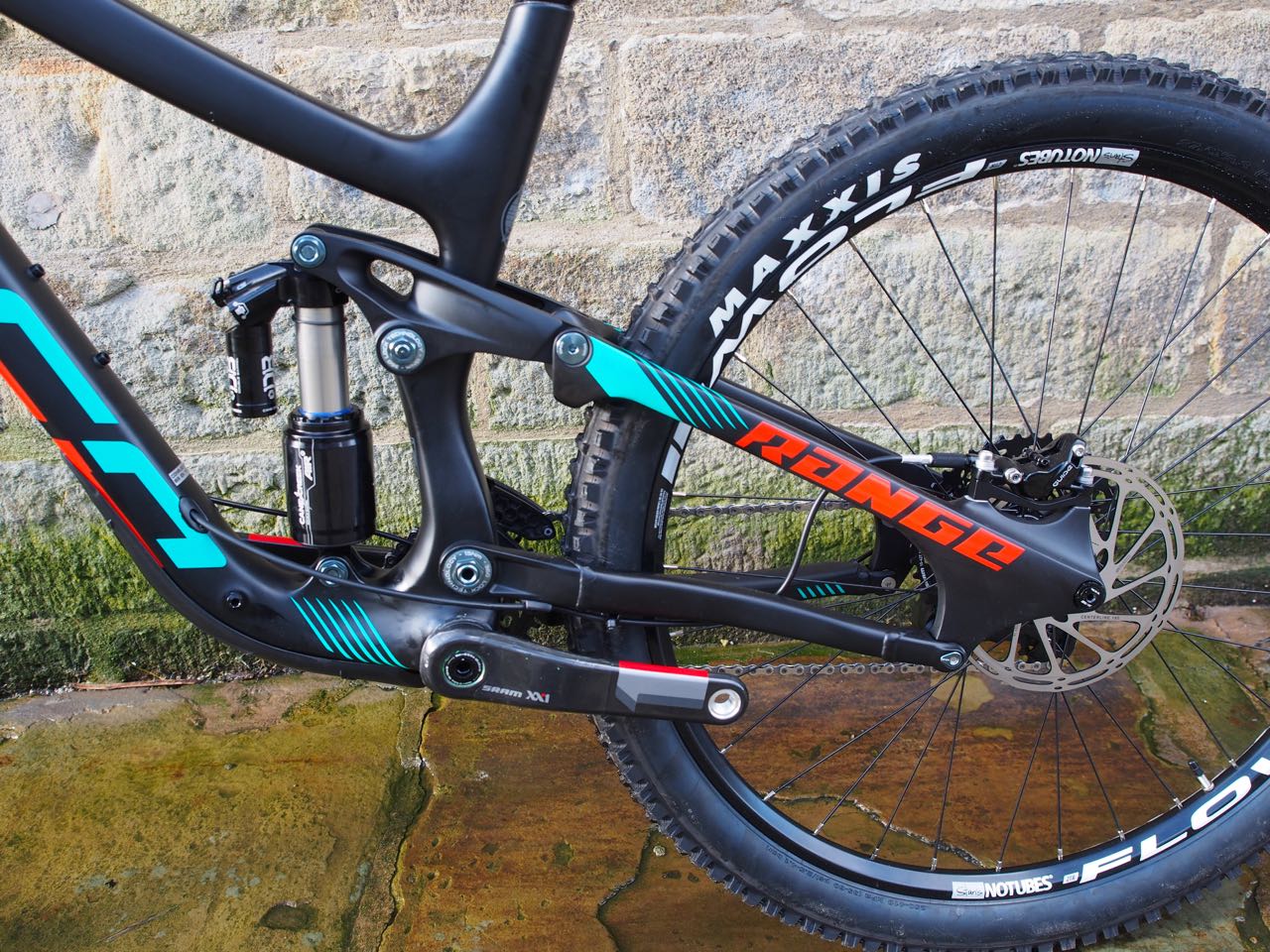 We scrawled: “Up front a 160mm dual position Rockshox Pike takes care of business. There’s a nice short and wide Race Face cockpit and SRAM Guide RSCs take care of stopping duties. Wheels are a nice mix of DT Swiss 350 hubs matched to Stan’s Flow EX rims just waiting to be tubelessed up with Maxxis 3C Maxx Terra High Roller 2 tyres.