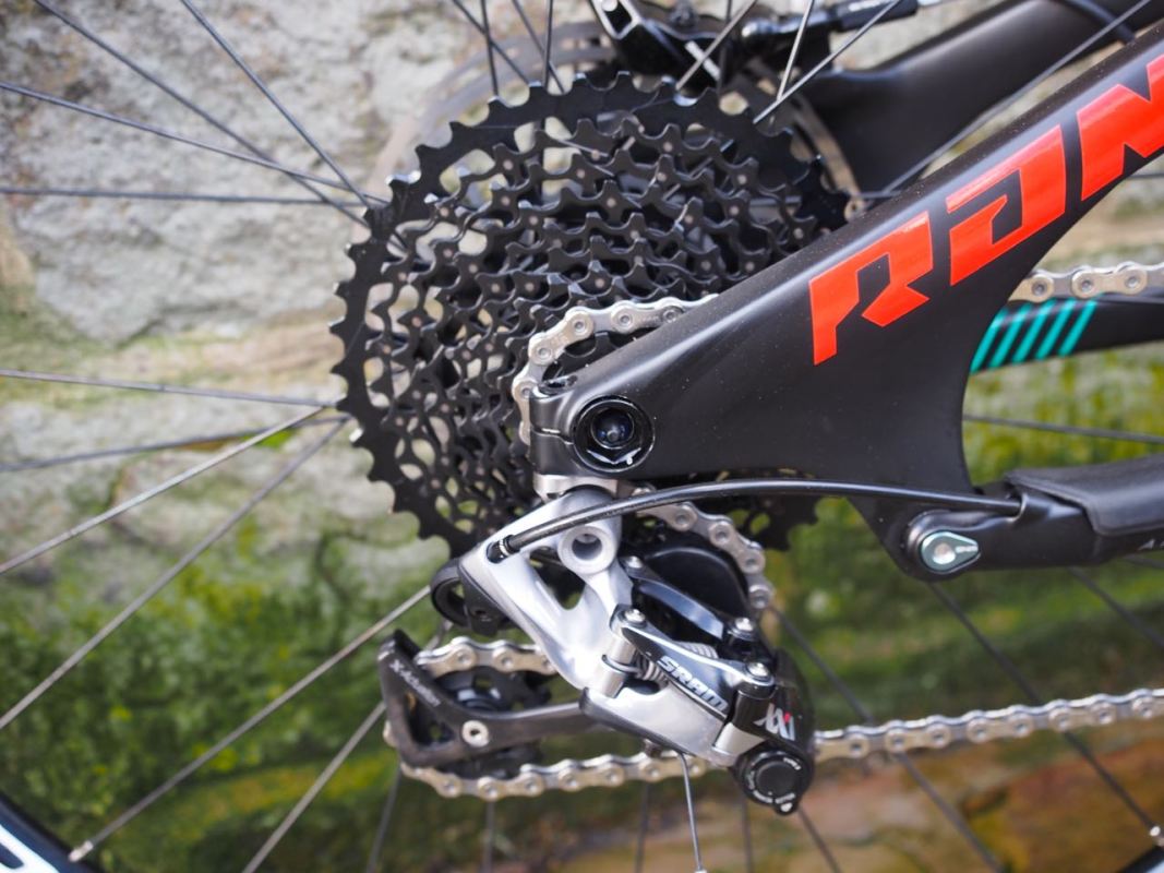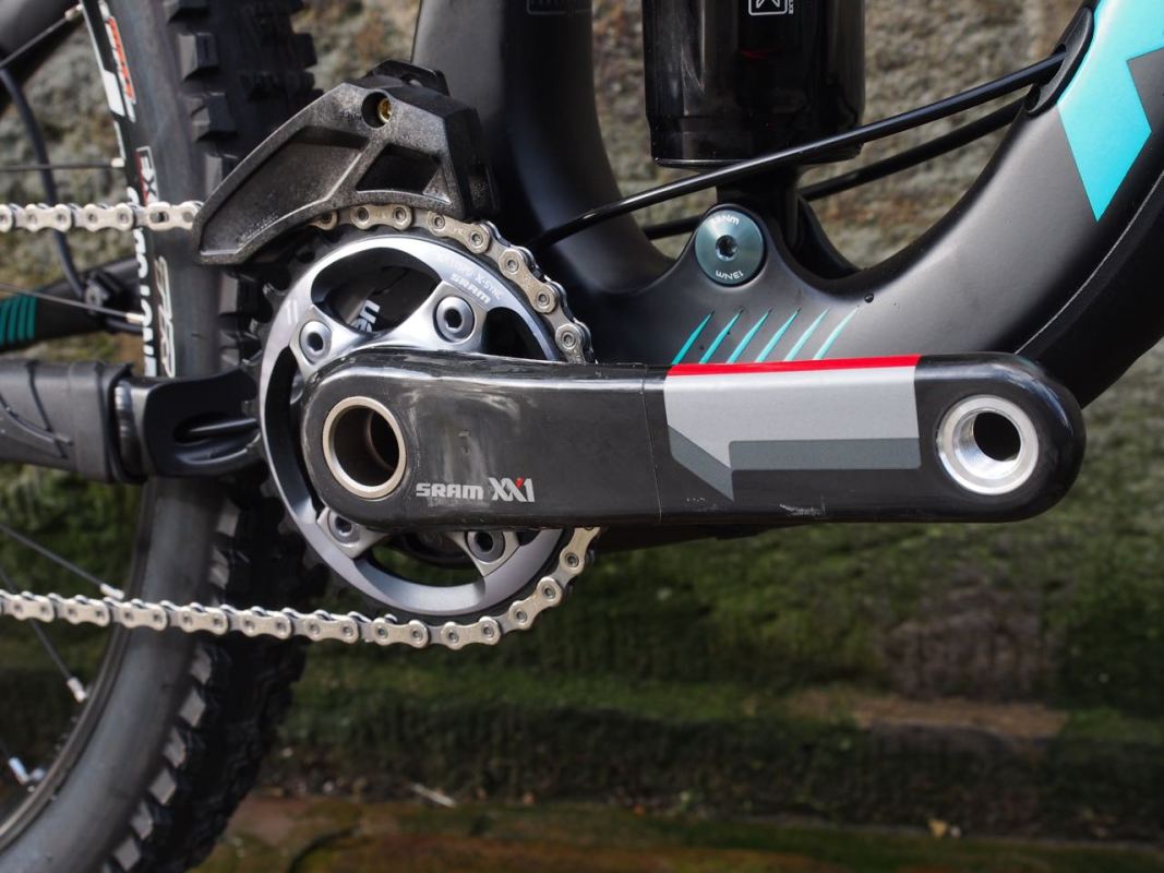 “A SRAM XX1 1×11 drivetrain deals with the pedalling bit of the fun promised. An X1 cassette completes the picture. Nice to see a 30T ring up front, someone’s been thinking about the need for a bit of spinning range to get you up those long alpine climbs. As the bike is also intended as an off-the-peg enduro racer, the inclusion of an E13 chainguide will be appreciated for that extra security.