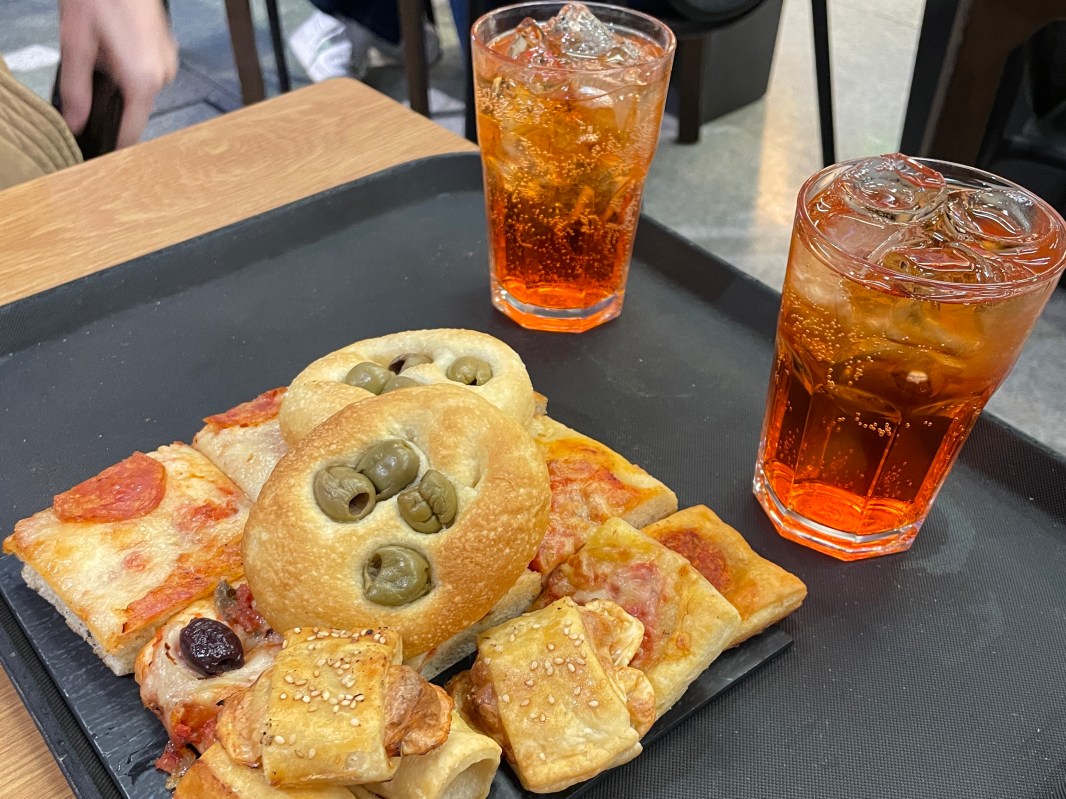 Behold, bought at a sort of Italian version of Greggs. Yes, that is a giant pile of baked goods snacks, and Aperol Spritz. €7.90 per person. Beats the pants off a steak bake meal deal. May affect how easily you can get into your pants too. But that’s what elastic waistbands are for. Or bike rides. Answers on a postcard for anything more joy inducing that costs €7.90 or less please.