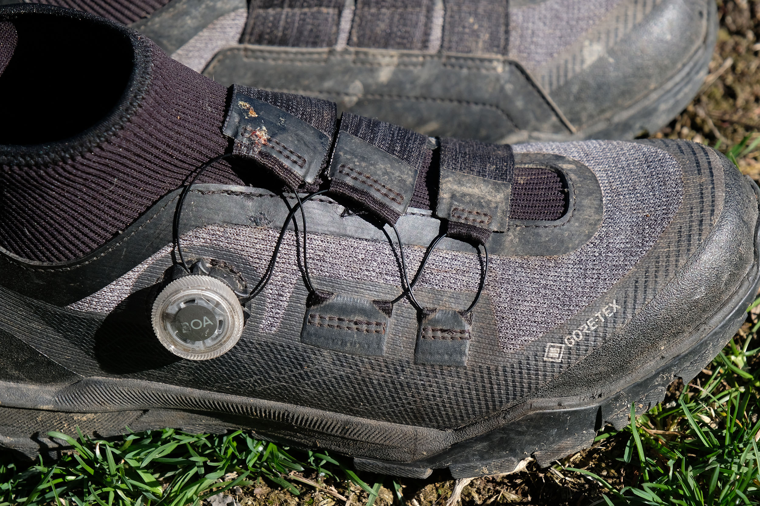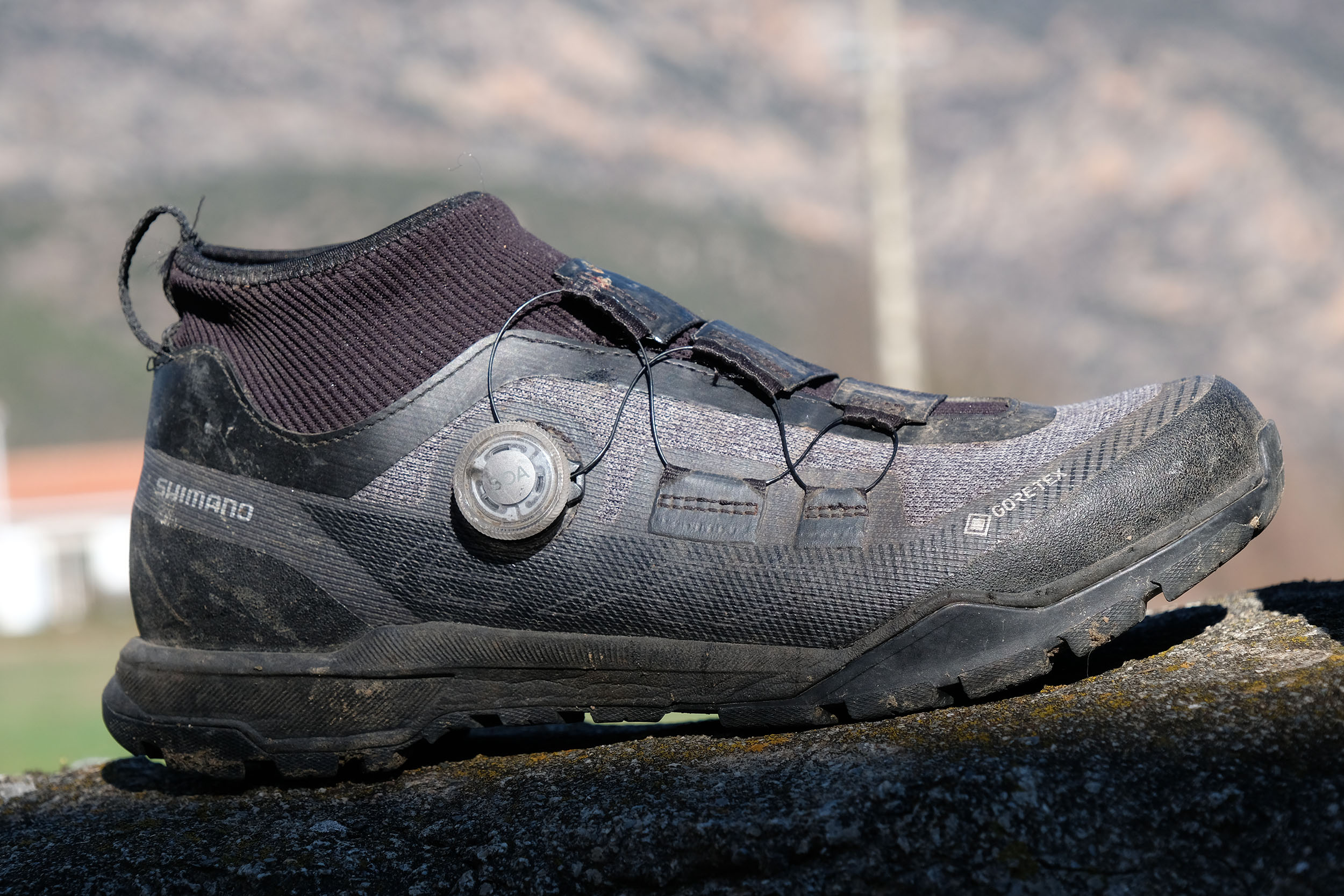 Shimano pitches these particular EX7 shoes as ‘Off-road touring shoes that deliver premium comfort and performance for exploring in adverse conditions’. They feature a GoreTex lining, a single BOA dial that pulls on three wide band straps and a tight, woven fabric outer that’s reinforced all over the place with rubber and nylon scuff guards. On the ankle, there’s an elastic scree guard that keeps (most of) the rocks out. This extends into and becomes the sewn-in tongue of the boot. – different from regular EX7 shoes, which just feature a regular shoe silhouette.