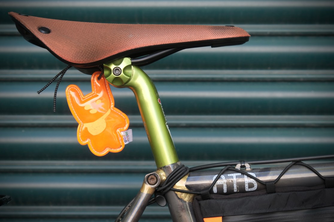 This is the Brooks Cambium. This is the orange as well. I was very weird with some of the colour choices on my bikes and I’ve added a couple of orange accents to the hubs and the headset. I thought I’d add that to it. When I first put it on there, I hated it. I was like, that’s not the right colour. I put it back on there a few weeks ago and I’ve been riding around on it. It’s such a comfy saddle. It’s the first Brooks saddle I’ve actually put on one of my bikes. I understand why [people like them]. It’s very, very good. The colour has grown on me now.