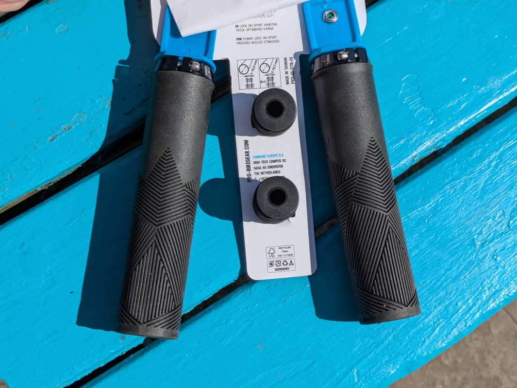 Some promising looking grips from Shimano PRO. Not a million pounds either. Featuring a missing section inside that makes them more squishy under the outside of your palm. Pretty thin at 30mm diameter. Nice bar plugs uncluded. Tapered collars are a nice touch. 97g all in apaz.