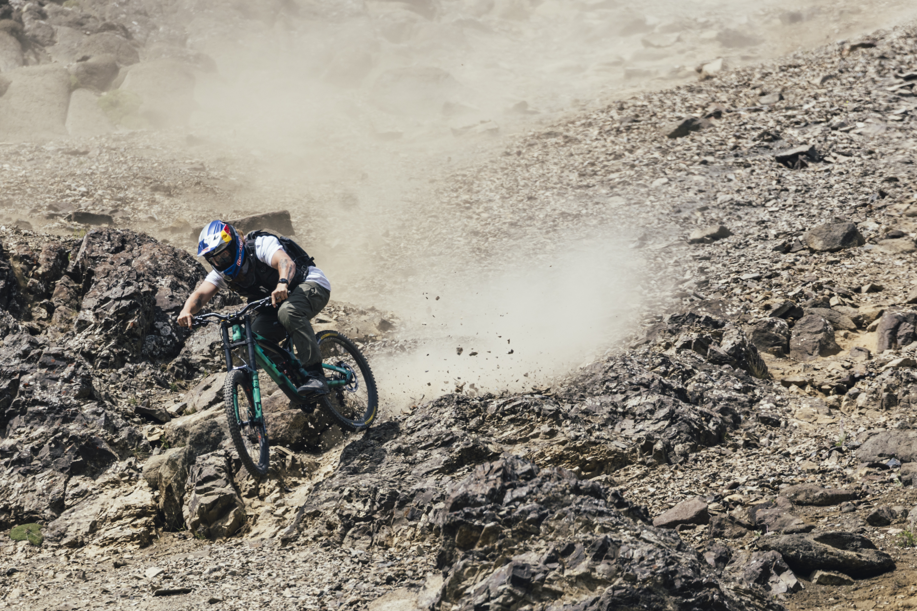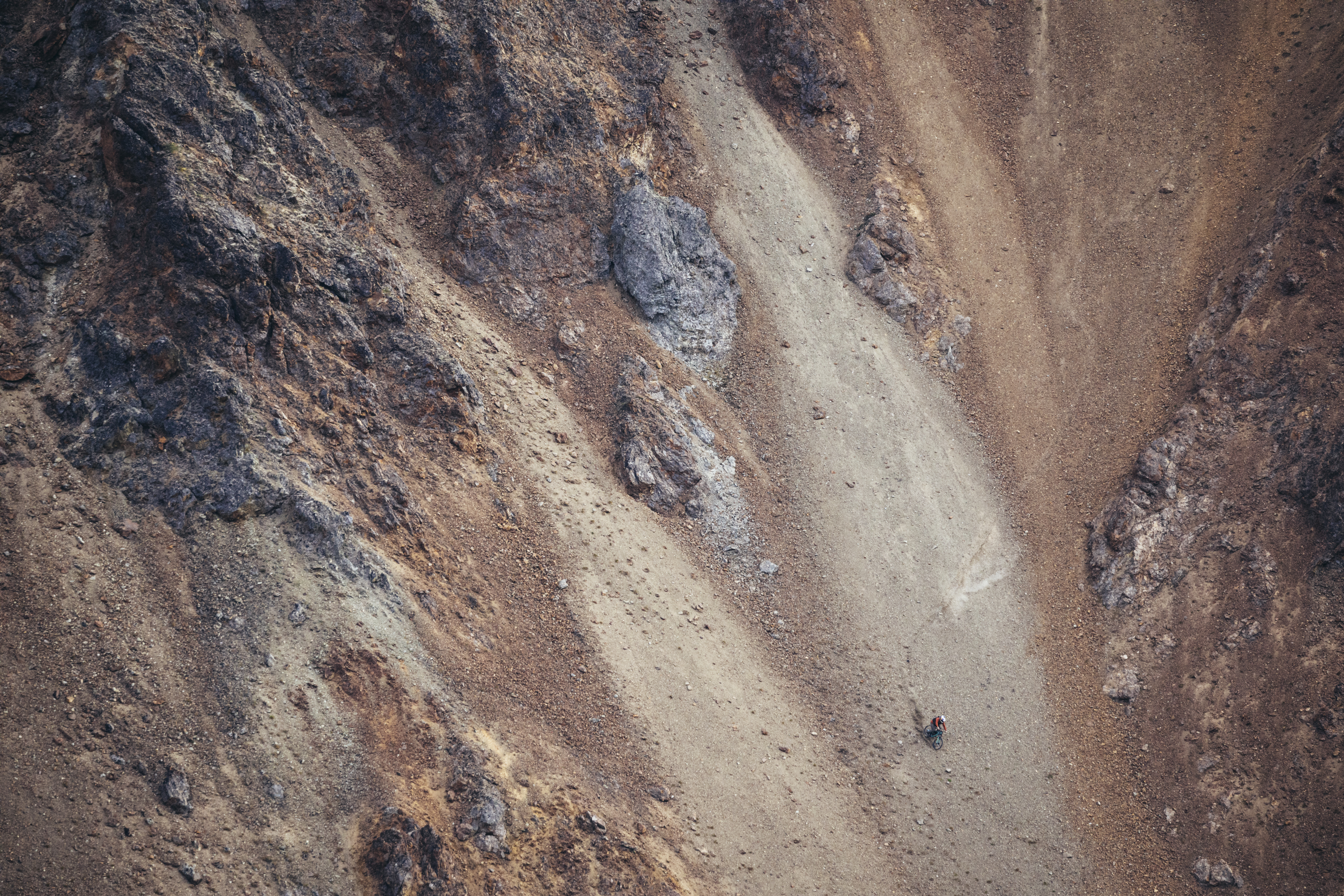 One of the main things I’m thinking about as I’m riding is speed management. A lot of the time you want to go faster, but you know that further down, there’s these big boulders and you just can’t [let go], because if you get up to speed and you can’t stop then, yeah… It’s a little bit frustrating sometimes because you would love to go faster on the top, but you need to keep in mind that you’re working with something way bigger than you. There’s not a few berms down there to catch you. It’s boulders or cliffs!