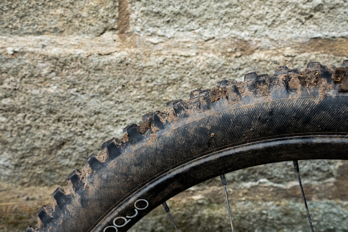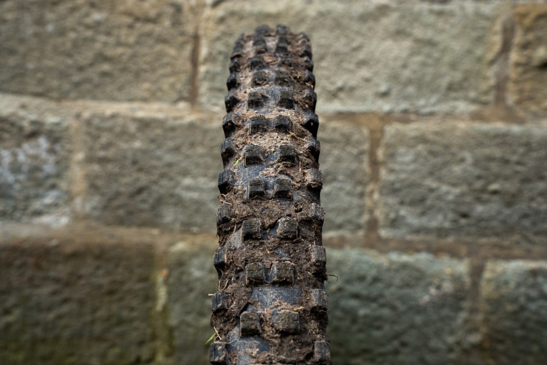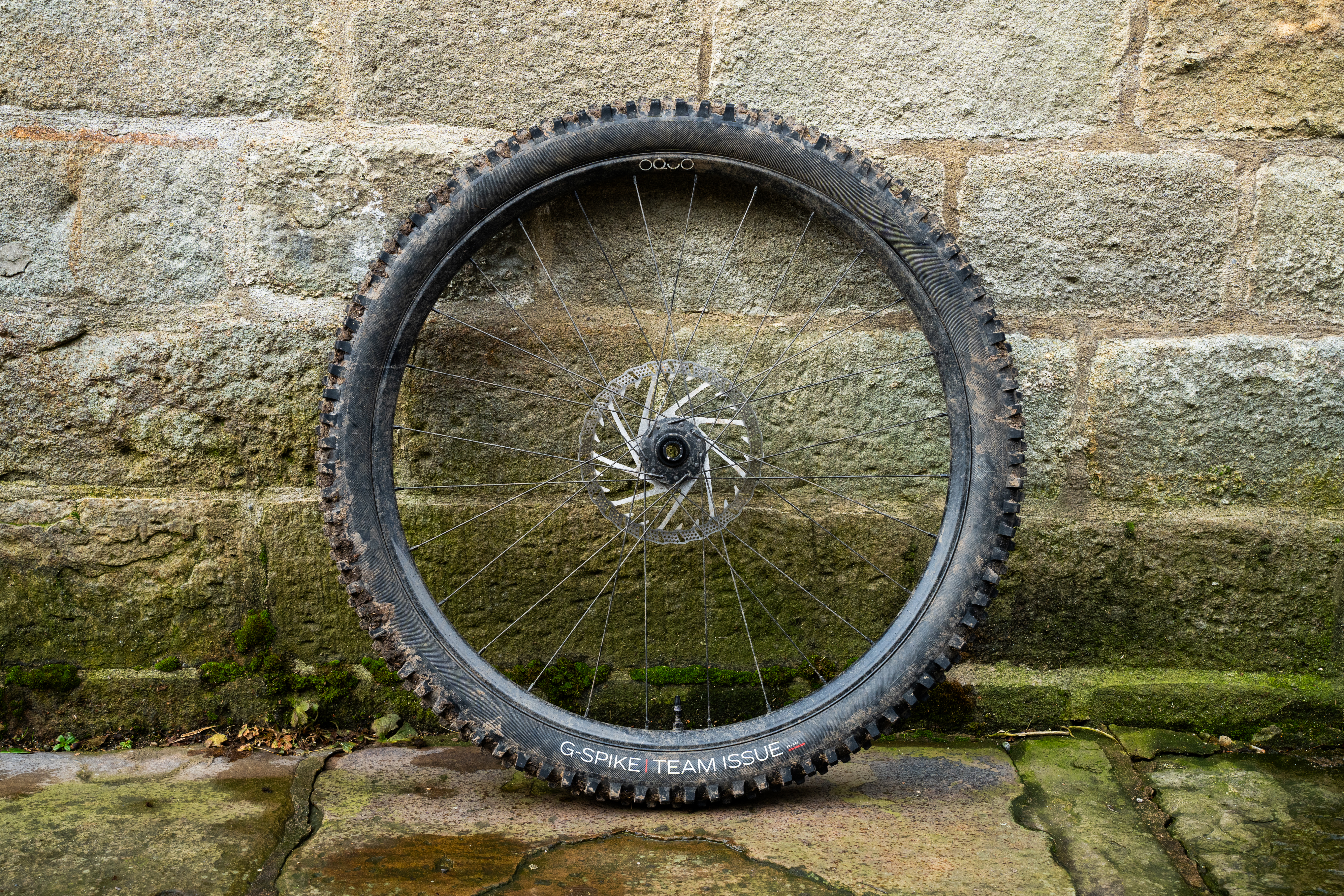A very mud tyre [sic]. Coming in at exactly 1,400g in 29 x 2.4 size, the G-Spike had better be good at its job because weight on your wheel is a real joysuck. The Bontrager G-Spike is extremely good at its job. Give it a raise. Hell, give it a promotion! Promote it to the top step of all-out mud tyres. Yep, step aside Mr Maxxis WetScream, there’s a new tyre in town. Except that it’s not new. The G-Spike has been around for years, flying well below the radar of most people (who aren’t Reece Wilson or Hattie Harnden anyway). What the G-Spike has going for it is pretty much all the traits of other mud spikes but with much greater levels of predictability and performance on firm stuff (roots and rocks) as well as a much more calm and… yes, comfy ride feel. Get it into the sort of terrain it’s designed for – steep, muddy and greasy tracks and off-piste ruts – and it performs amazingly well. The tall-spiked knobs dig into soft ground providing a summer-like grip no matter what the weather is doing. Even on deep, wet, leaf mulch-covered trails the G-Spike adds control and offers a good level of grip. Those deep central knobs also offer loads of braking traction adding to wet weather confidence and letting you happily drop into trails that you might usually leave for the summer months. And it’s not just about straight-line grip. The aggressive side knobs let you lean things over and push the front into turns. For steep, natural tracks the G-Spike is pretty hard to fault and is up there with the best.