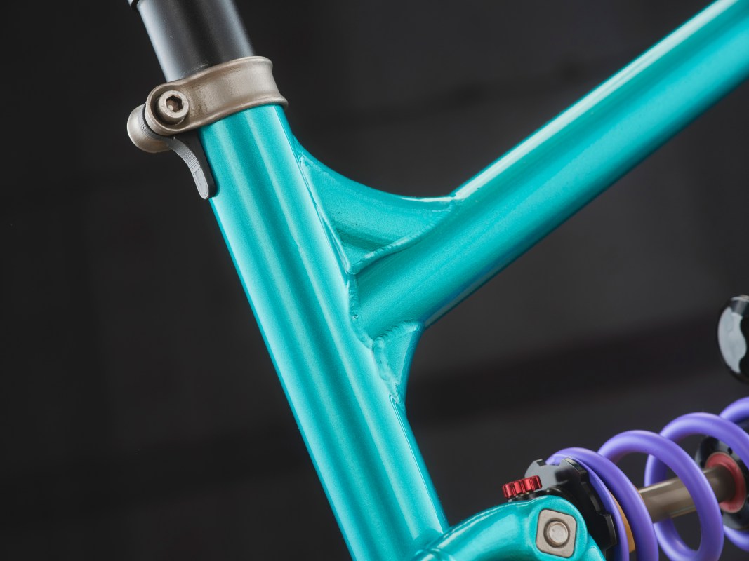 You’ve got like a socket [for the tubes] so it’s a really easy construction. You just cut the tubes. These are just standard. The front triangle is T45 carbon steel tubing. This is a Datakai 29er formed chainstay. And then this is T45, T45, and that’s a Randall seat post. You just cut the tube straight, slot it in, and weld it. Really easy. I’m also looking into brazing it, and looking at other construction methods.