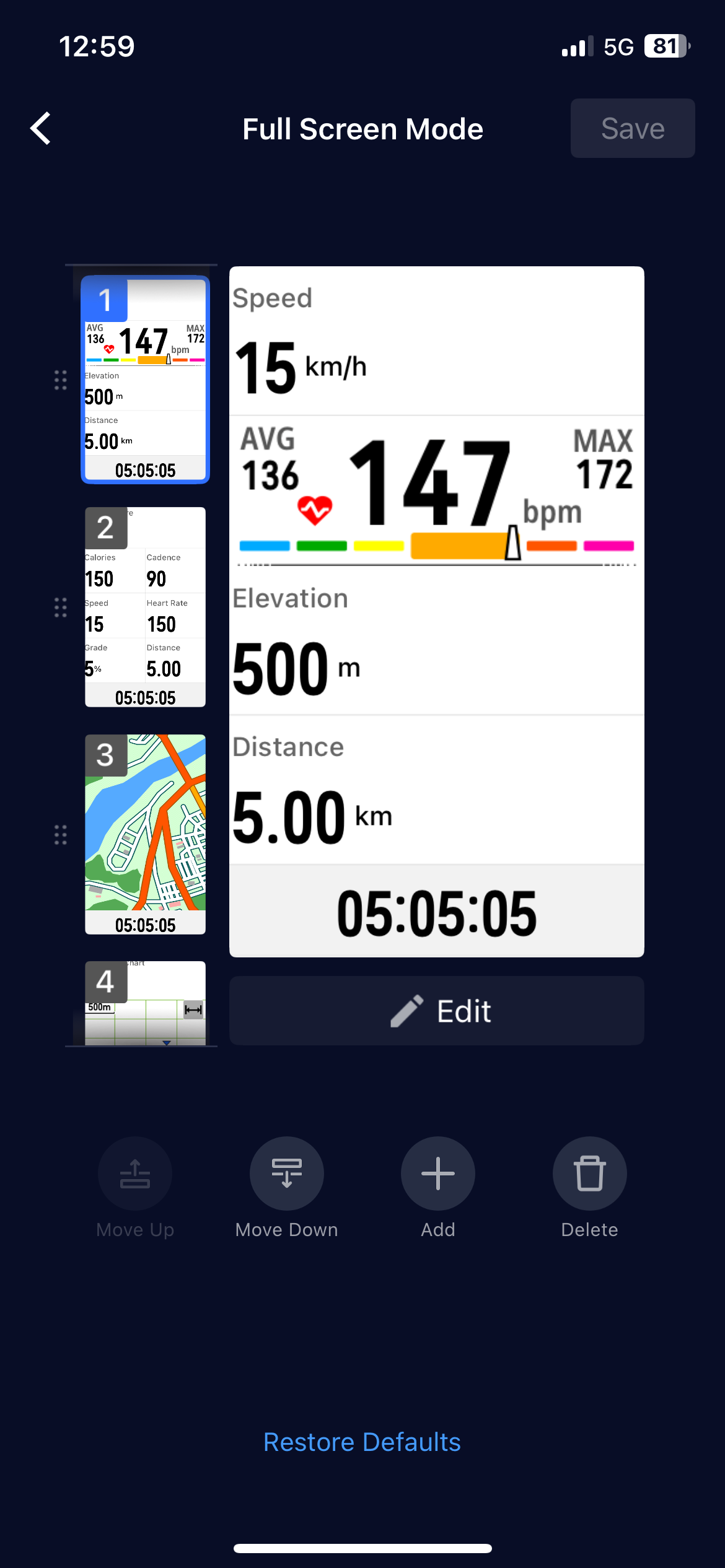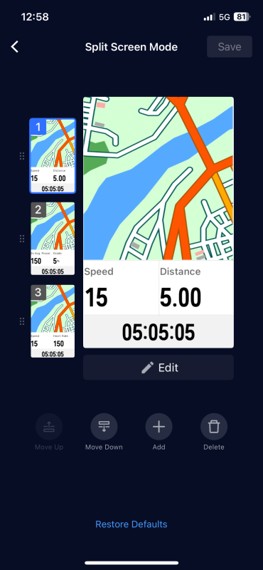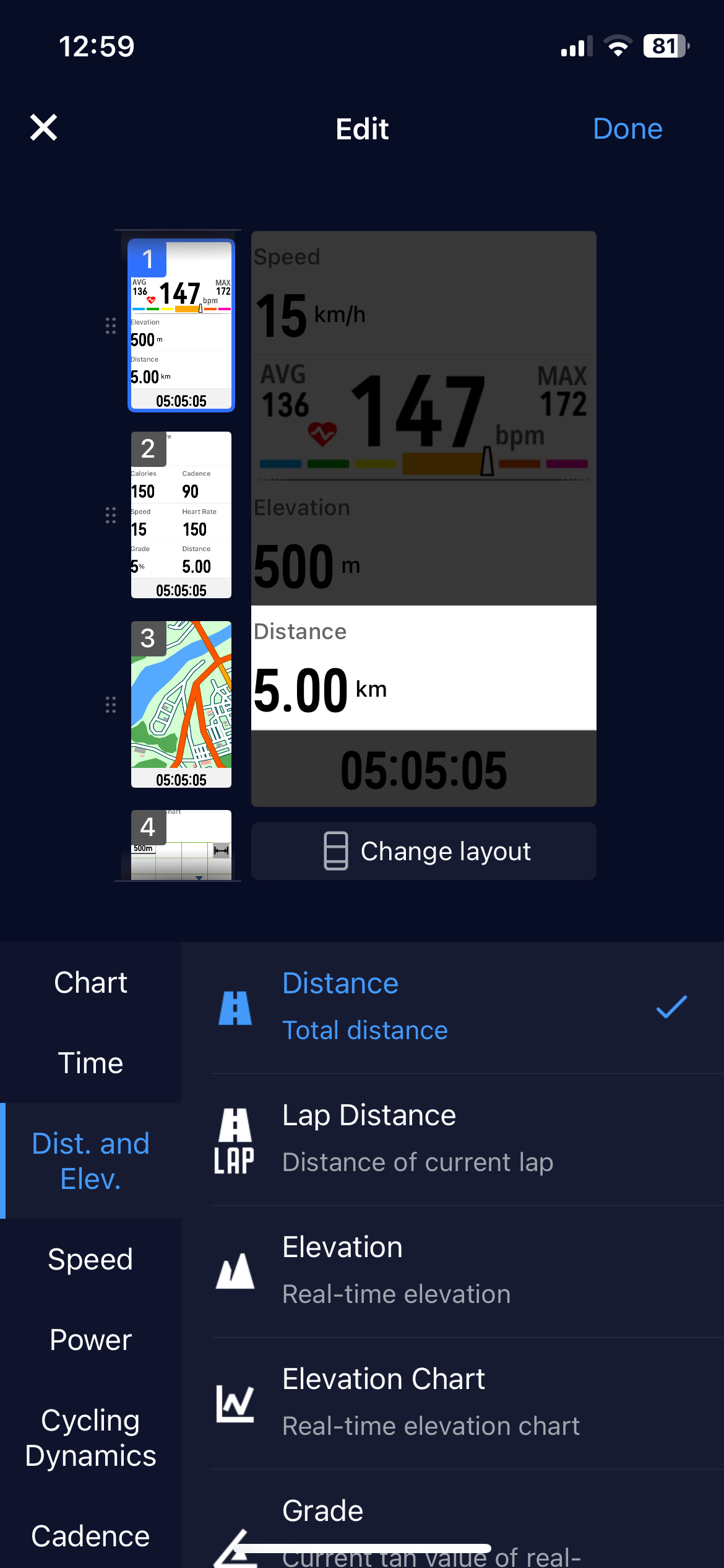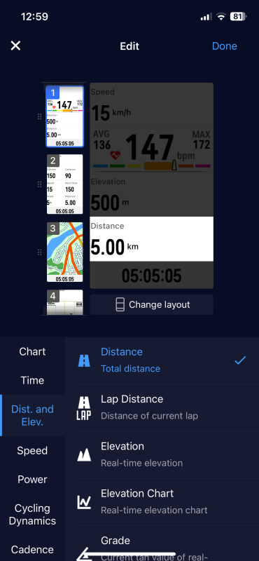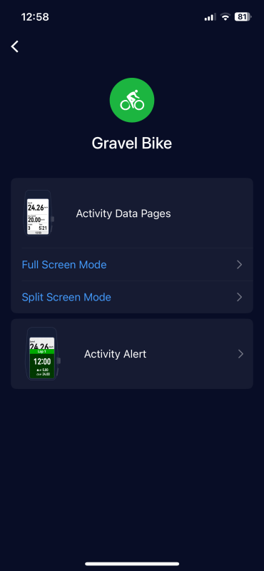 All of that can be displayed – or not – on the screen in front of you. Using the phone app, you can pick and choose what the screen will display according to what you need. Plus, you can have different screen arrangements for different types of riding. Choose from road, indoor, gravel, mountain bike, e-bike, and e-mountain bike, and pick whether you want a nice big display of your heart rate, the map, your cadence… whatever. This is absolutely zero faff to set up, and the phone app generally is nice and easy to navigate.