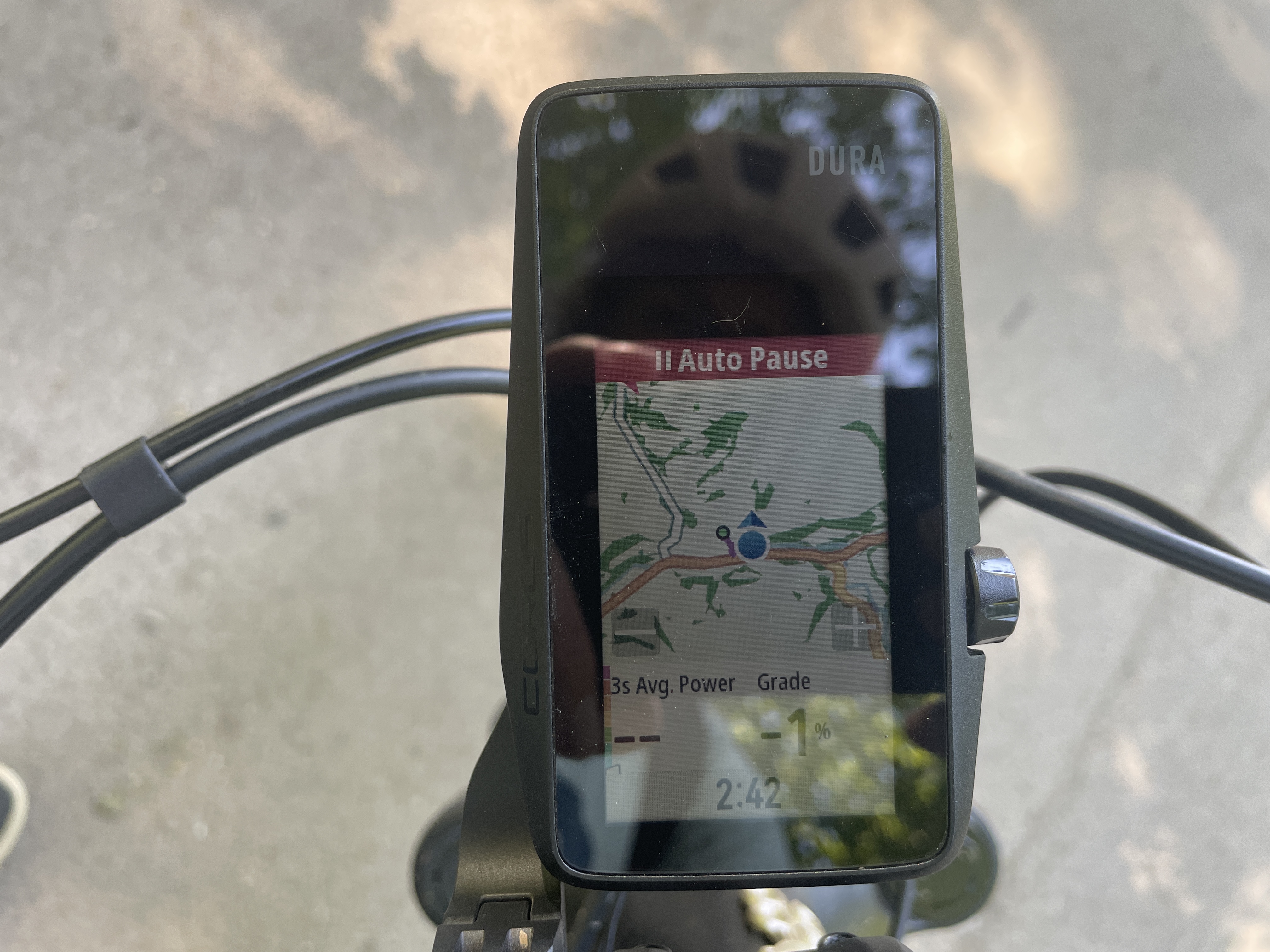 If you want to do a route but you’re not quite on it, it can navigate you to the route, although I think this feature is a little clunky and had a tendency to keep trying to send you back to where it thought you should join the route, rather than figuring out you’d ridden in a different direction and perhaps there was now a better/faster option for joining the gpx trail. But, not bad, and once you get fairly close to the route you can see your location and the planned route on the screen. Once you meet the route, it gives a spirit-lifting and celebratory fanfare of a chirp.