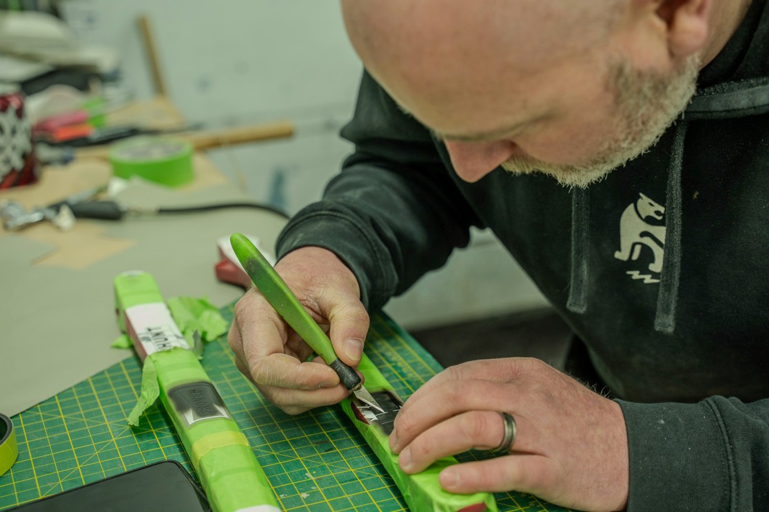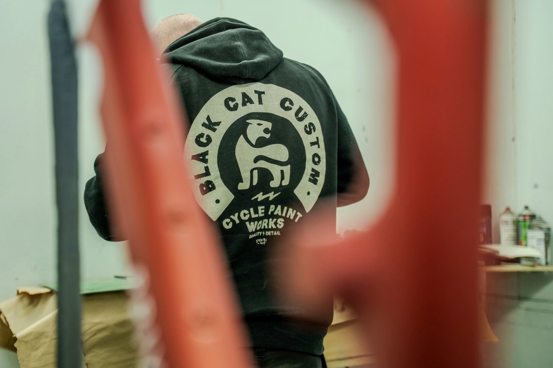 I spent a full day with Stu as he cut out and carefully masked each element of the design and painstakingly painted each. The seatstays alone took hours, and that’s after fully stripping and prepping the frame prior to paint. The guy is a legend and a true artist!