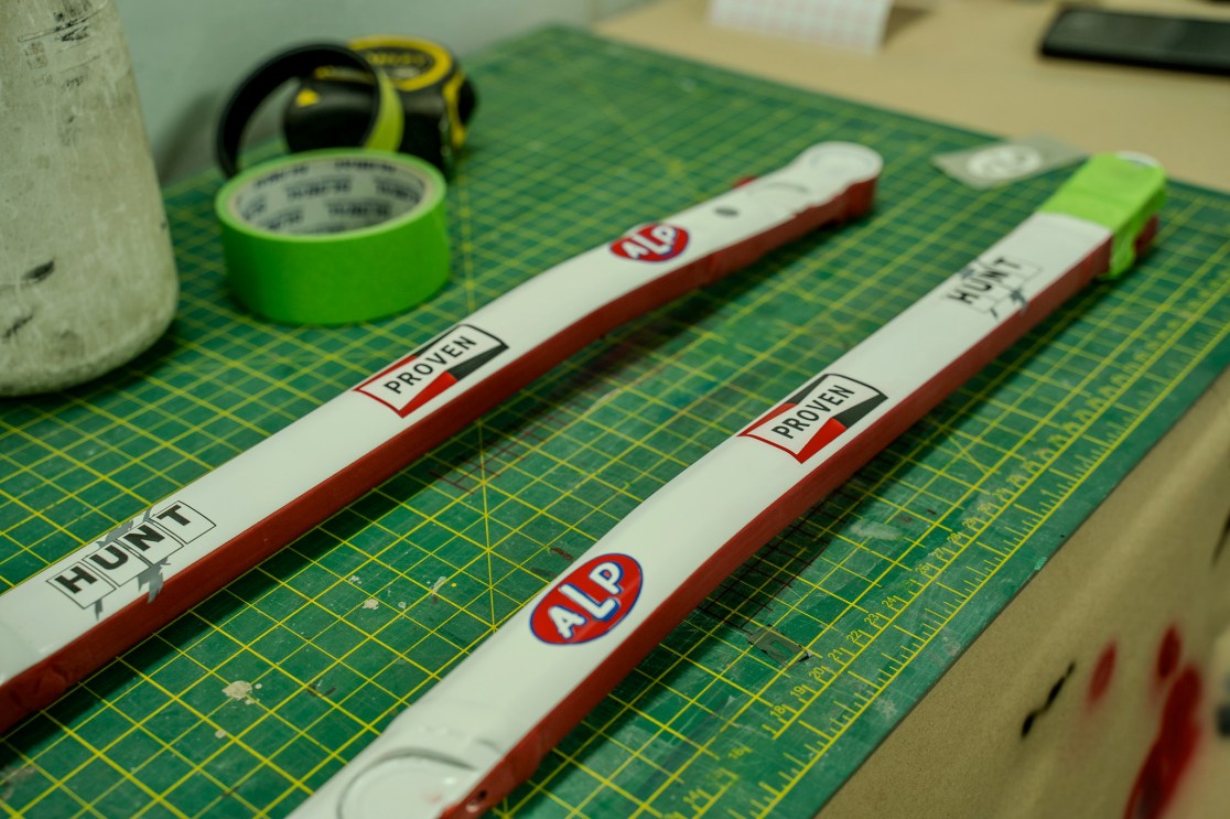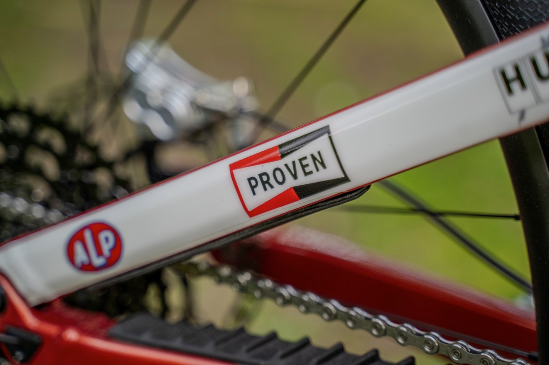 Not knowing that Stu actually masks and paints each and every graphic on his custom bikes, I didn’t really understand the scope of what I had designed, especially when it came to the (period incorrect) HKS-inspired ‘HUNT’ on the seat stays, which sits alongside the other ‘sponsors’. A Champion sparkplug inspired ‘Proven’ logo, named after the carbon wheel range from HUNT, and the STP oil ‘ALP’ logo (the name of Privateer’s ‘Aligned Linearly Progressive’ suspension system).