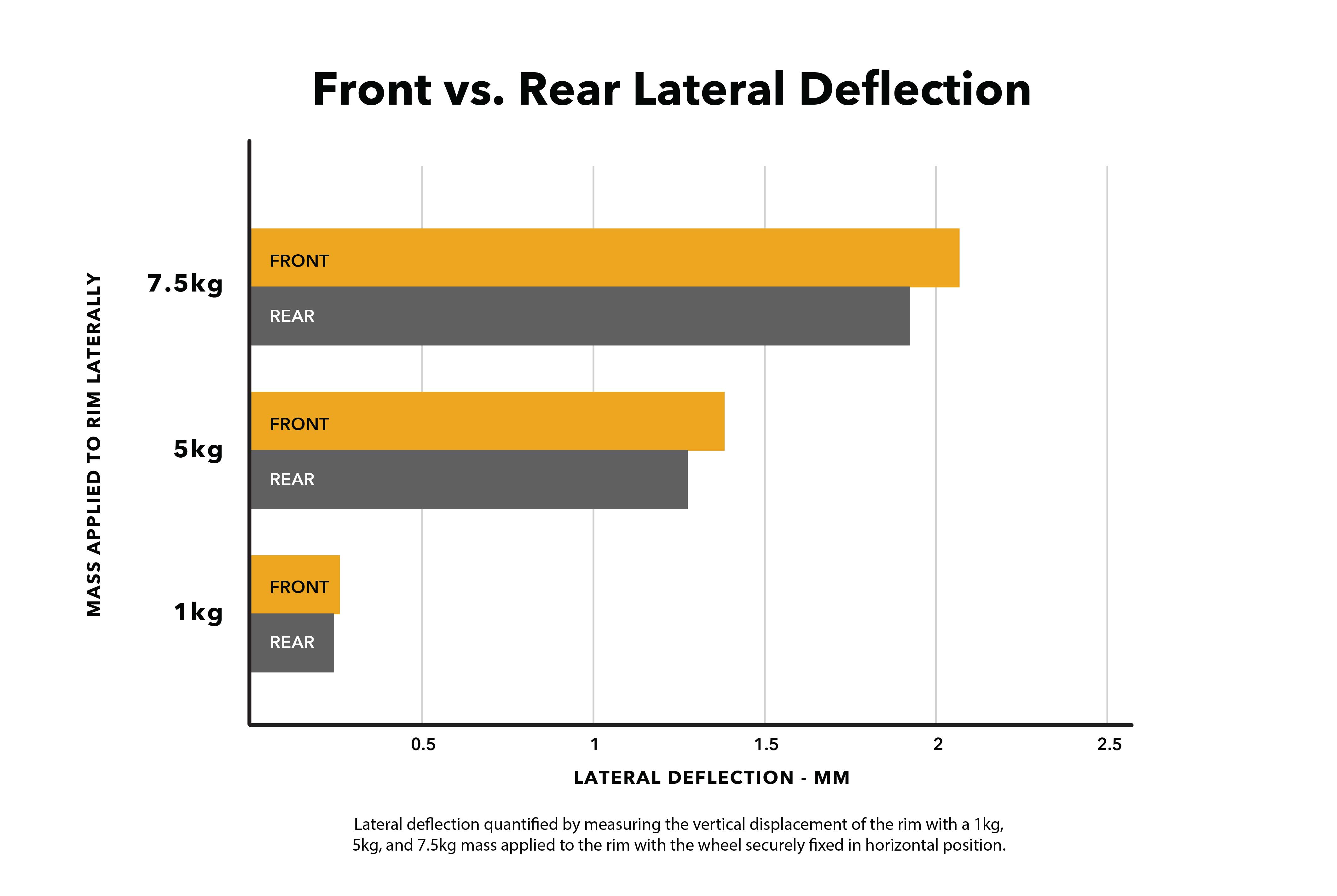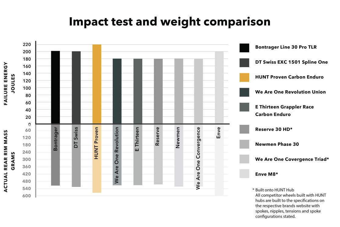 Within HUNT’s in-house testing protocols using their custom impact rig, the rear wheel achieved an impact rating of 220 joules – the highest rating measured among the relevant wheels in the category, with the front wheel achieving an impact rating of 170 joules. Read more about HUNT impact testing methodology here.