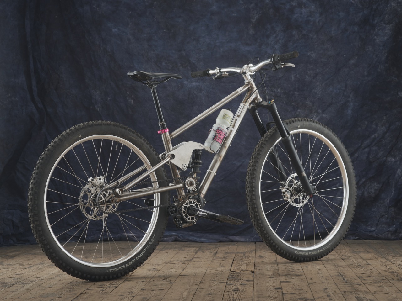 This is a Pinion gearbox, belt drive, full suspension, mountain bike. It’s an idea I’ve wanted to build for quite a few years. This one in particular, I’ve made it quite adjustable so that I can learn more about suspension by changing it up and set it up in different ways for different uses and just learn from it.