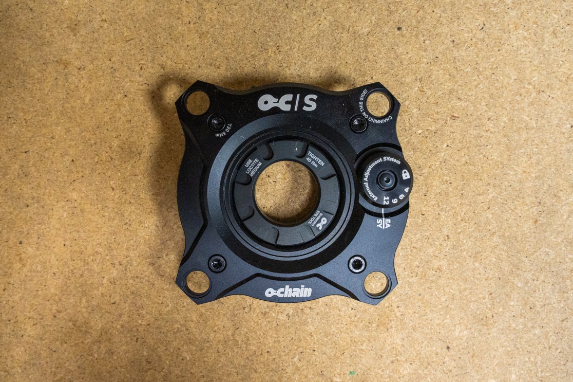 For those who don’t know, Ochain is essentially a chainring that is able to move backwards independently from the cranks (by up to 12°). The theory goes that it frees up your rear suspension to move and react to bumps and trail features without any feedback getting through to your pedals ie. classic pedal kickback theory. Even if this theory is now becoming more and more questioned (I, for one, don’t really think it happens to a signficant degree) the Ochain does something else: it’s a chain damper. This alone may not as fancy or significant but chains are heavy and they whip about up and down alarmingly over rough terrain (it’s this chain bounce that some people is Actually What You’re Feeling). Anyway, we’ve got one for some primo chinstroking. And to put up against the Rimpact version we already have.