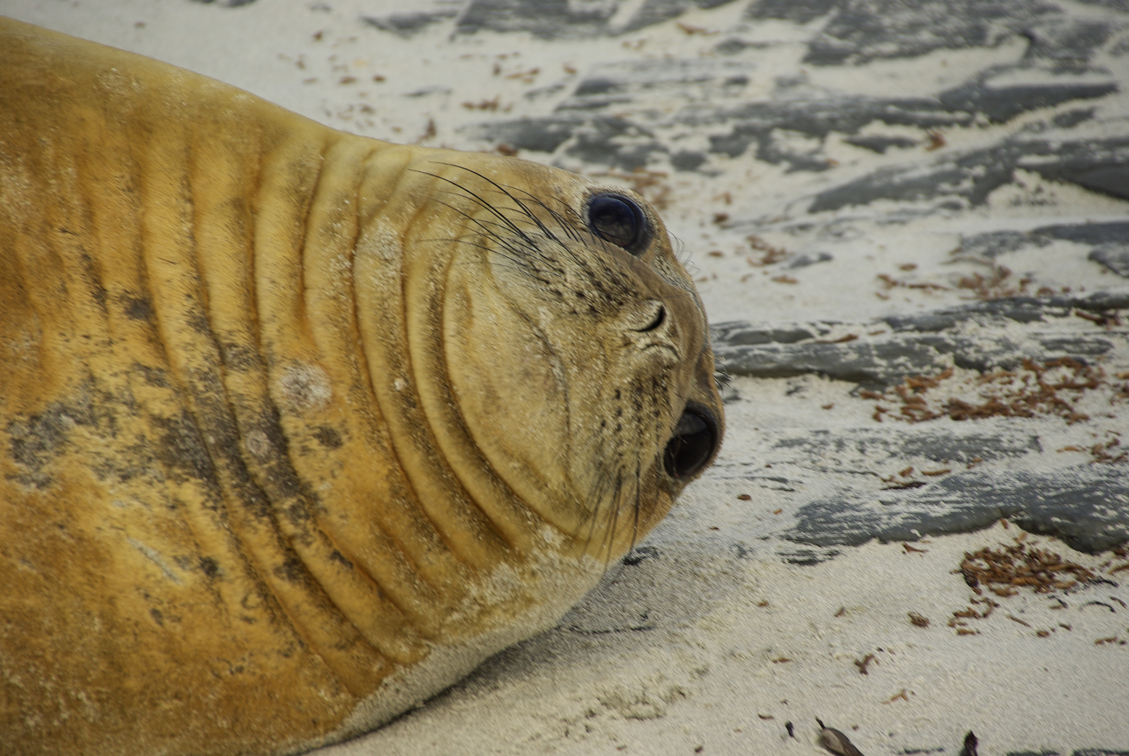 We then had a fast descent into the bay at Port Sussex. Towards the bottom of the slope we briefly encountered two short, steep slopes known as Hell’s Kitchen. I’ve since done this in winter conditions and I know why it got its name! Just past Hell’s Kitchen, we encountered another roadblock. We waited because that’s what you do in the Falklands when wildlife claims right of way. Several elephant seals had come ashore at the head of the bay and were lounging on the road. Around 20 Upland geese waddled past, leading a parade of goslings. They eyed us suspiciously but proceeded with dignified determination. “Local traffic,” Dan chuckled, “they always have priority.”