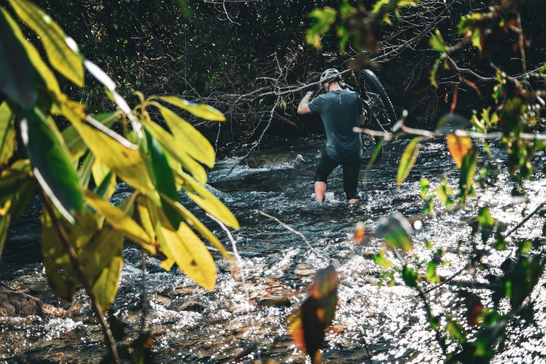Despite appearances, they’re very friendly. They greet me with a smile, and one even helps me manhandle my bike across a treacherous wire bridge that’s been damaged in the hurricane. The people I meet can’t seem to help themselves being hospitable. Even at 35,000 feet over the Atlantic, before I even arrived on American soil, I met Josh. We happen to be sitting next to each other on the plane and his entertainment screen is drooping. I mention I had Allen keys with me that would sort it. Making it clear I don’t plan to commit some very technical act of plane-dismantling terrorism, I explain I have a bike with me and all of a sudden, we’re off. Josh is telling me about trails, people to ride with, where to eat, and his bikes. An hour or two disappears and I land in Charlotte armed with all the information I need.