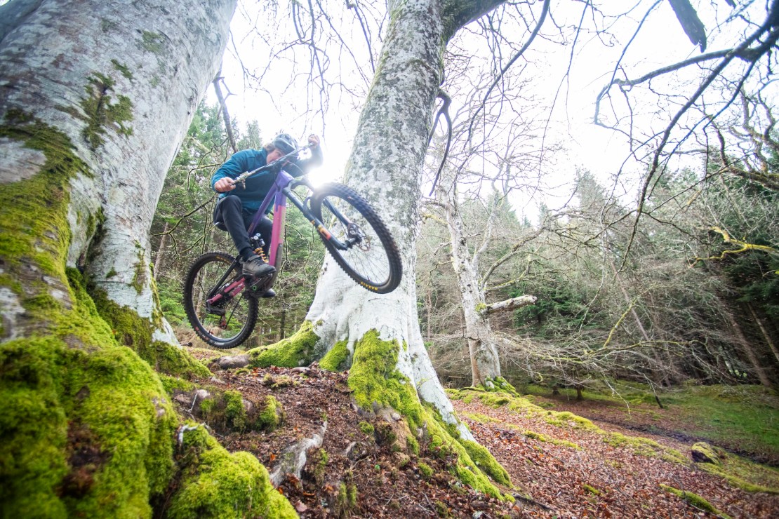 It doesn’t take long before we’re heading off to the next spot by way of another ribbon of singletrack and find more of a natural bombhole. An old sunken track now makes for the perfect rooty sender and all three of us are ticking along the air miles as we go. This part of the woods feels like a green room as the moss, lichen, pines and rhododendrons all bring their flavour of green to the party, highlighted by patches of strong April sunshine.