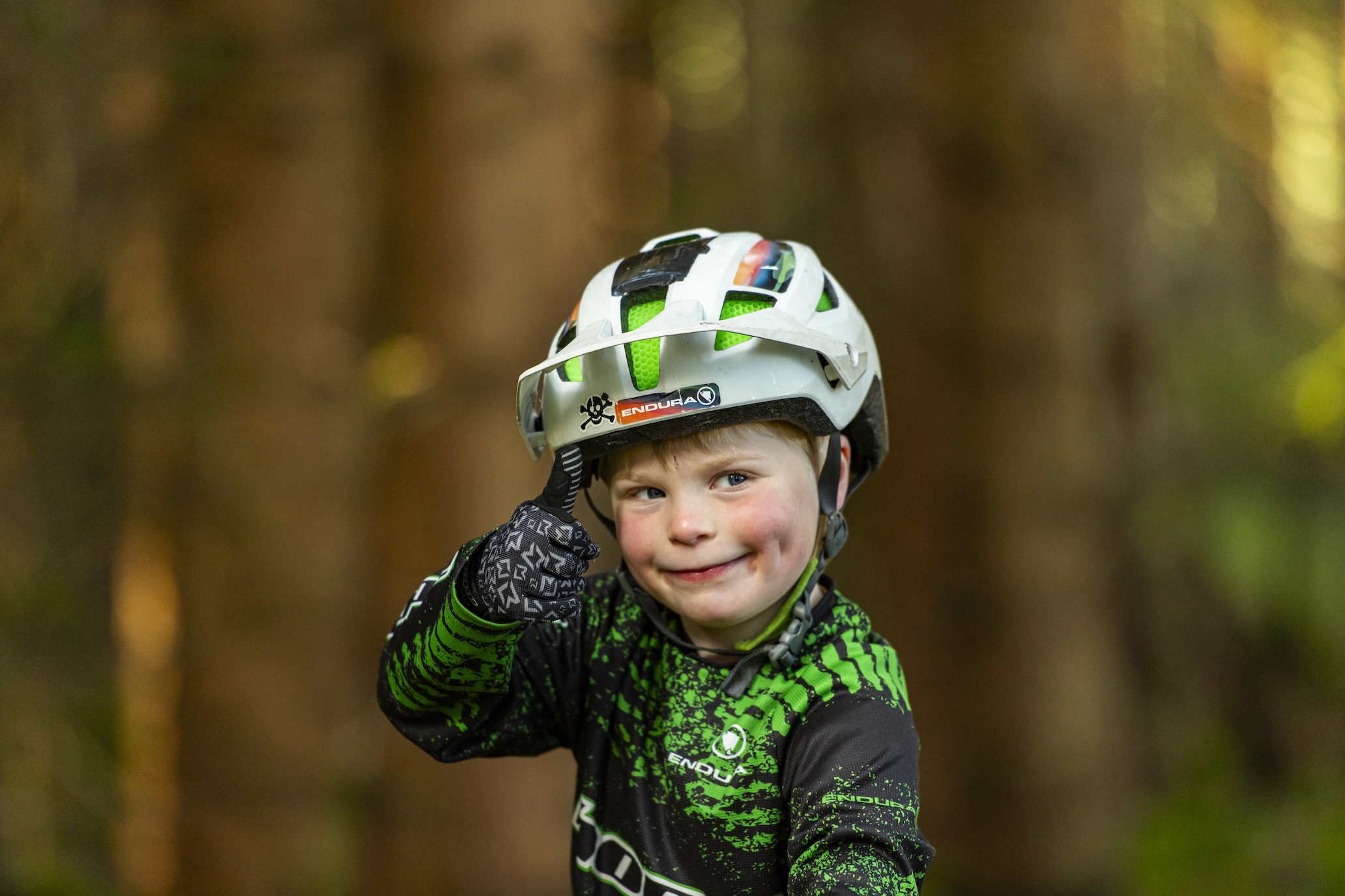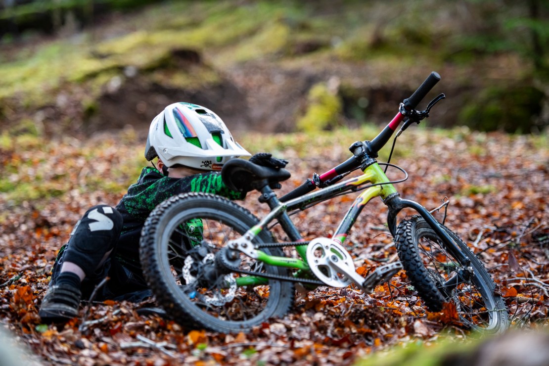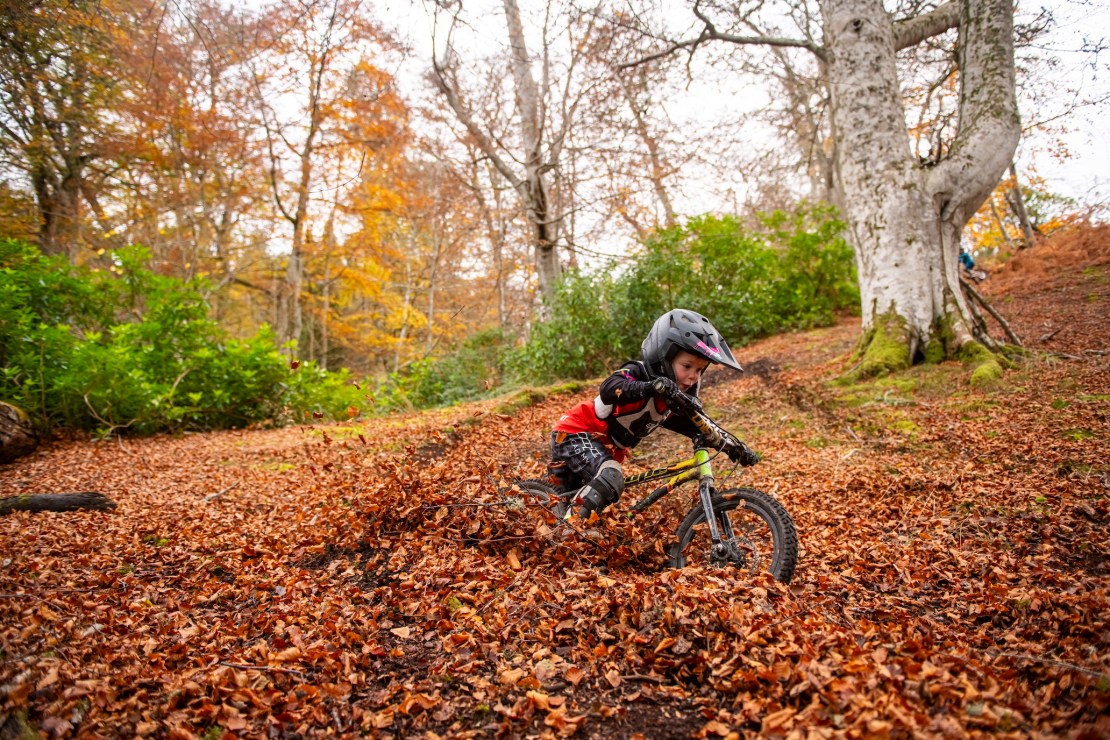 Our first port of call is a bombhole jump, handcrafted by two-thirds of the Barnes boys, a very good long stone’s throw away. Bo is immediately doing better turnbars than I could ever dream of. Start ’em young I guess. Soon to be on a pedal bike with gears and suspension, his matchy-matchy black and green with flames Hope bike is the weapon of choice for today’s outings, as, according to Bo: “It’s better for jumps.” It’s also pretty good for skidding through beech leaves too by the looks of it.
