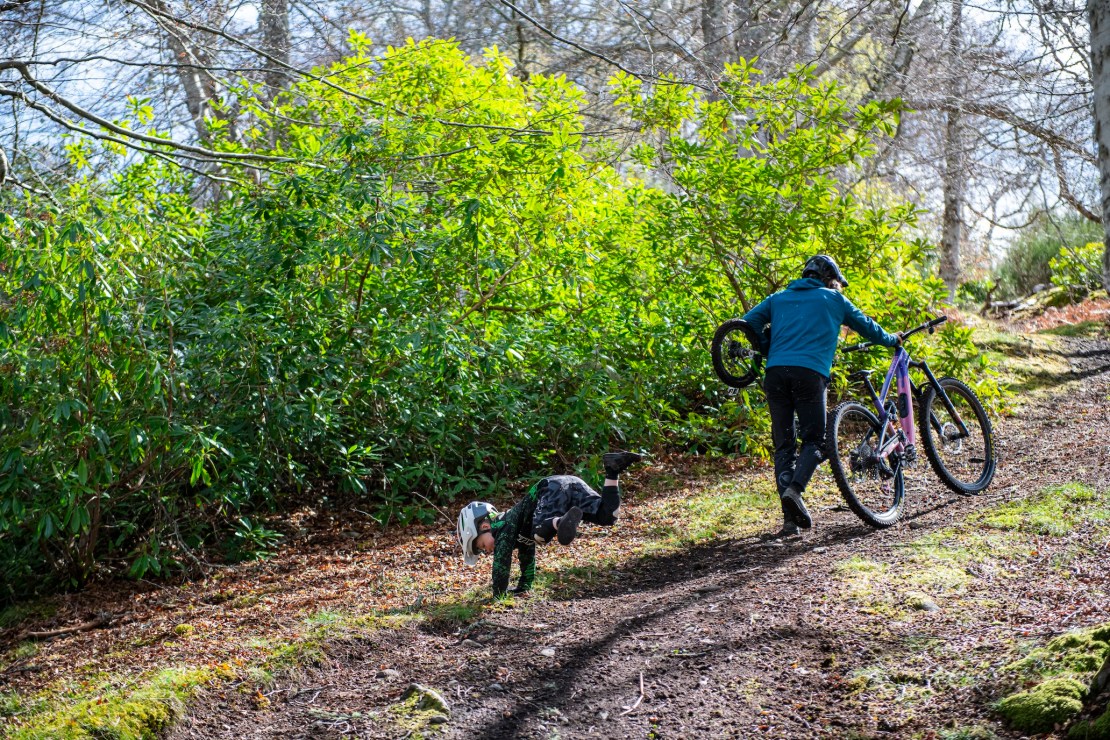 After a heap of laps at the Abriachan pump track with Bike Wash Man as Joe tuned the legs up on the cross-country lap, we’re all fairly cooked. A day of skids, laps and giggles is exactly how a day on the bikes should go. Despite being well worn out by the day’s antics, there’s always time for more silly legs. I just need to come up with a silly walk that lets me stretch while I’m doing it.