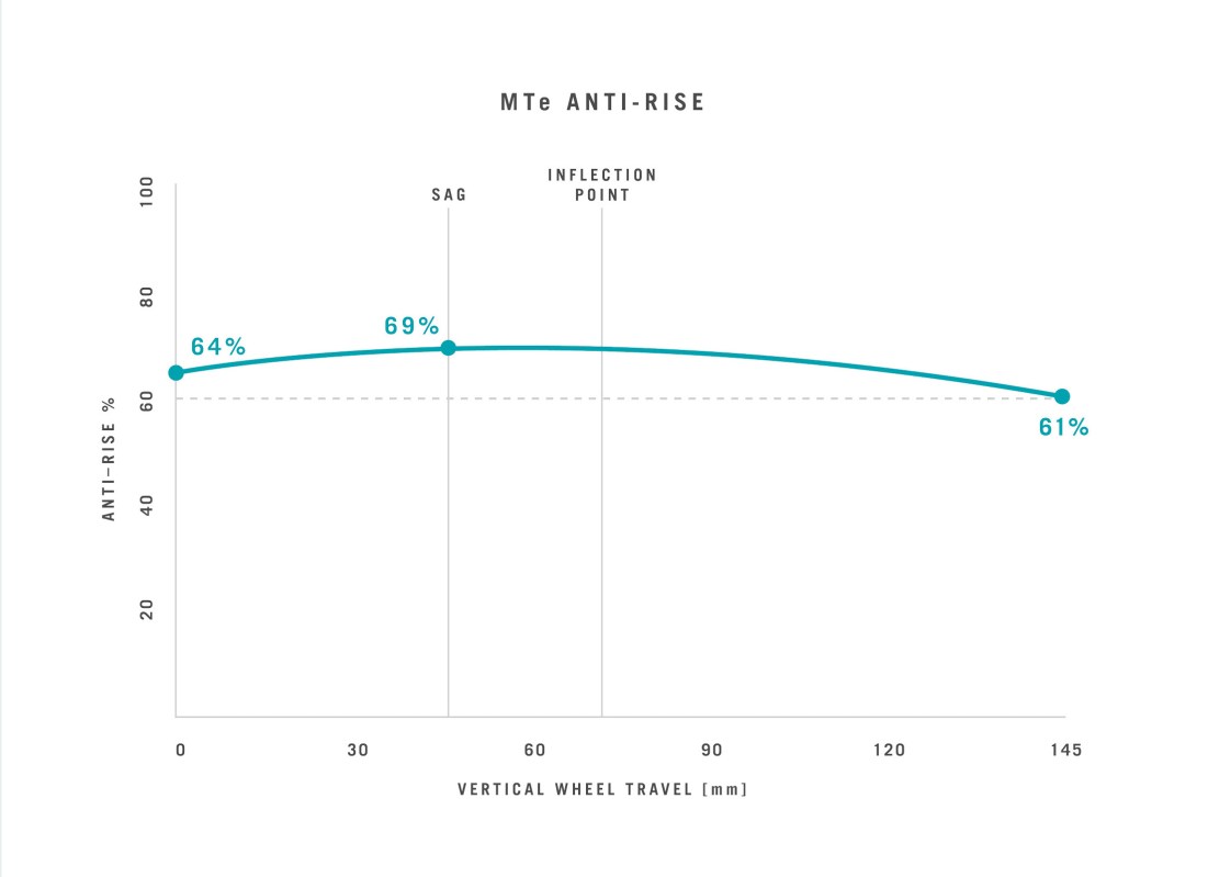 With Sixfinity, we tune pedaling efficiency at sag to maintain the same parabolic anti-squat curves seen with Switch Infinity. The curves are then scaled inversely to the MTe’s electric assist. As a result, the MTe anti-squat magnitudes are intentionally greater than the full power 160e, yielding an appropriate balance of traction and pedaling efficiency. Plus, as the Switch Link moves up, pedaling support is provided where desired, with a higher anti-squat centered at sag extending across the pedaling zone. As the Switch link moves down, the anti-squat sharply drops off for descending performance.
