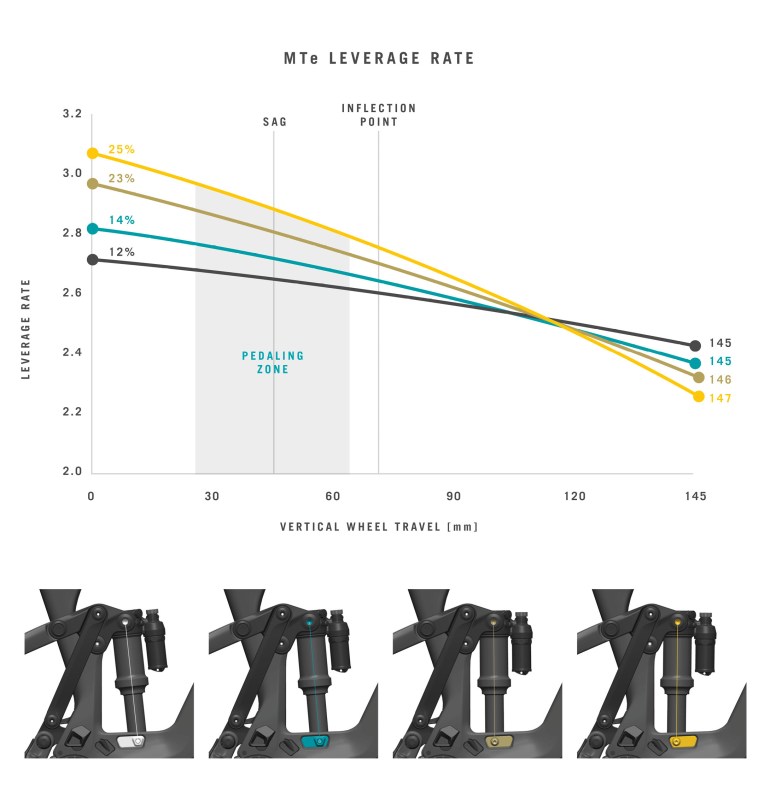 With the MTe, you can adjust the Sixfinity leverage rate progression to fine tune to your riding style, shock choice and terrain with the flip of a chip. Choose supportive and efficient, or a livelier feel with more bottom-out resistance. In all settings, the linear shape of the MTe suspension curves will provide consistent, confidence-inspiring predictability.