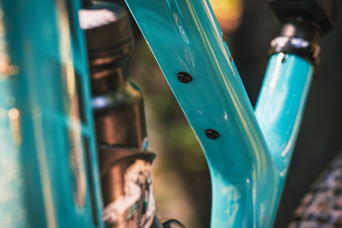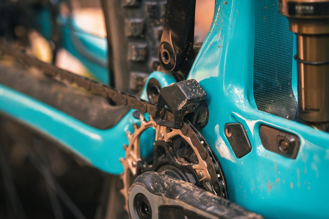 On the muddiest race days, the integrated rear fender keeps debris from impeding suspension movement of the Sixfinity switch link. To protect against rock strikes, the MTe features a downtube guard that doubles as an access door, facilitating battery swaps and service access to internally routed cables.