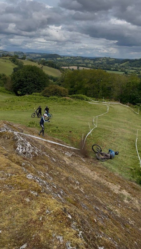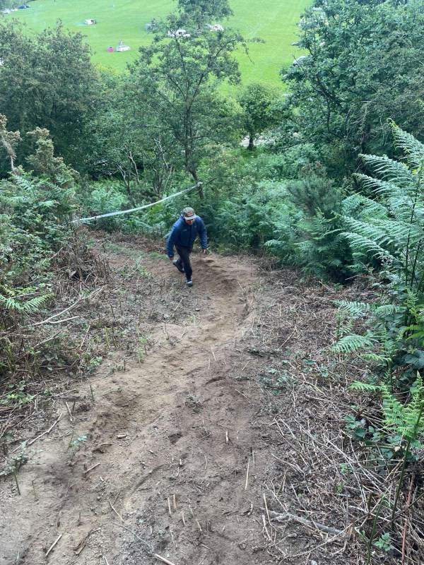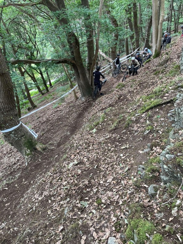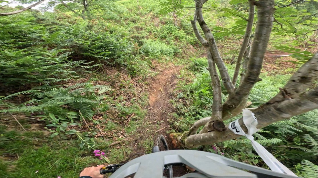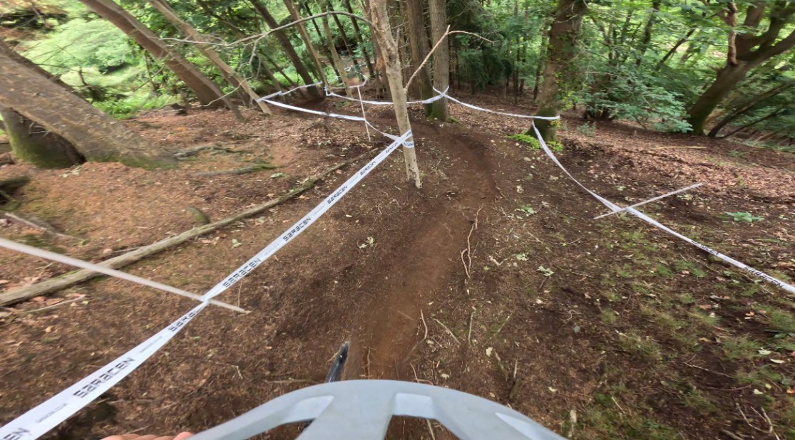 The woods began with a wide, rocky feature which then led into a left turn and a traverse. Holding speed was crucial for the traverse here, so the clearest line through the rocks and the corner was to stay right into the rocks and try and keep the brakes as open as possible into the left hander. The track then suddenly steepened up but with not much support in a muddy right hander before a sprint to the finish at the bottom – riders had to be careful not to carry too much speed in here.