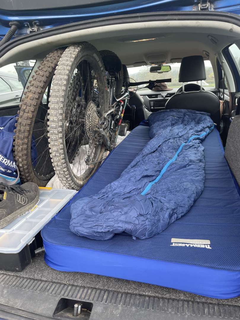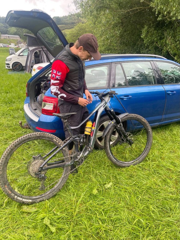 My race bike setup: Giant Reign 1. Lezyne pump attached to a Crankbrothers BC18 bottle cage, spare tube in the frame stow. Car also served as an excellent tent and race pits!
