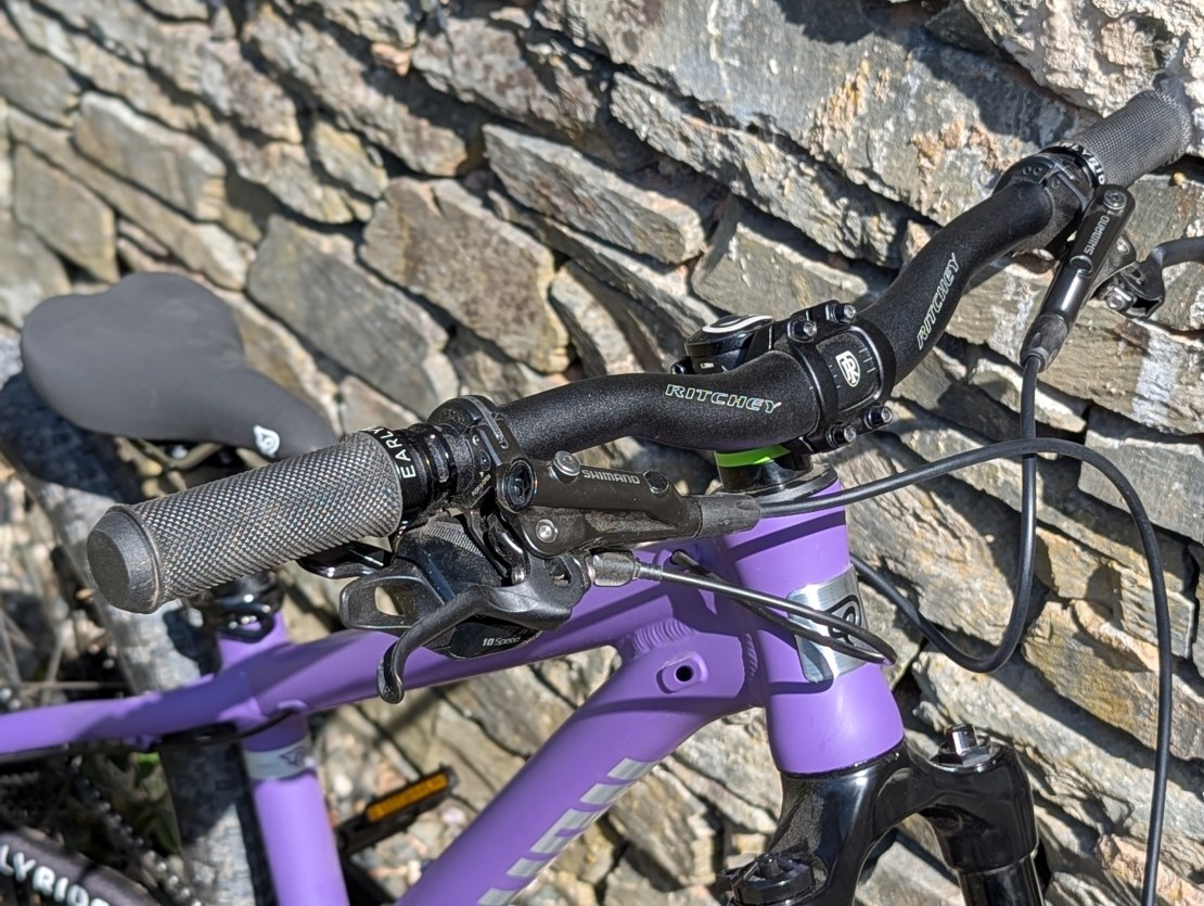 The geometry is pretty progressive by conventional wisdom on childrens’ bikes, which tends to assume they’ll need quick steering over stability(!) The 67° head angle may not be too exciting by the standards of large wheel adult MTBs, but it’s great for a kids’ bike.