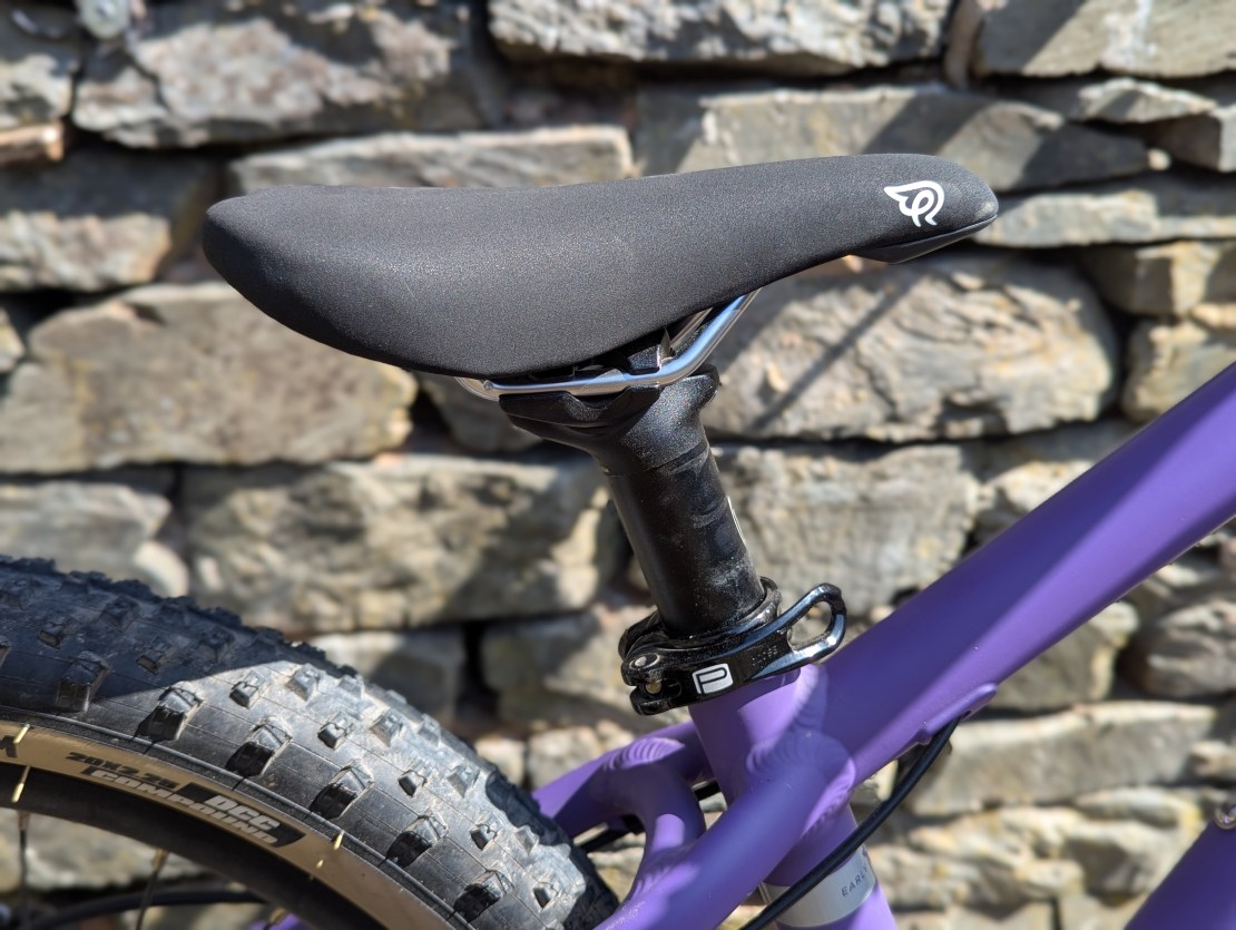 The alloy frame is very nicely finished, with details like a bottle cage mount and dropper post-compatible internal cable routing. I’m glad Early Rider are now offering a couple of colours, while still keeping things plain – you could always jazz it up with some patterned stick-on frame protector film. My daughter happens to be very keen indeed on purple things, which helps.
