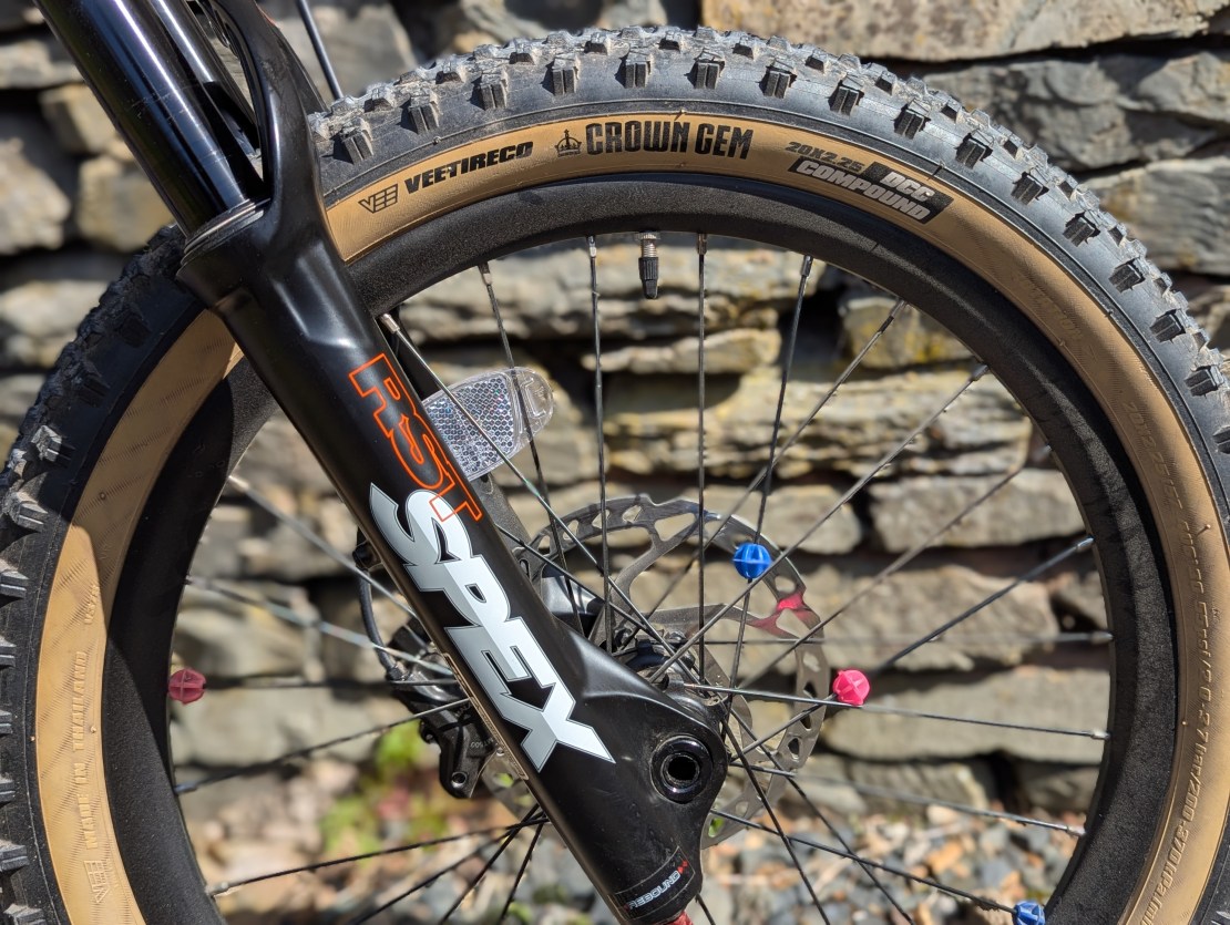 Vee Crown Gem tyres in 2.25 inch width are proper mini mountain bike jobs with a decent balance of grip and speed.