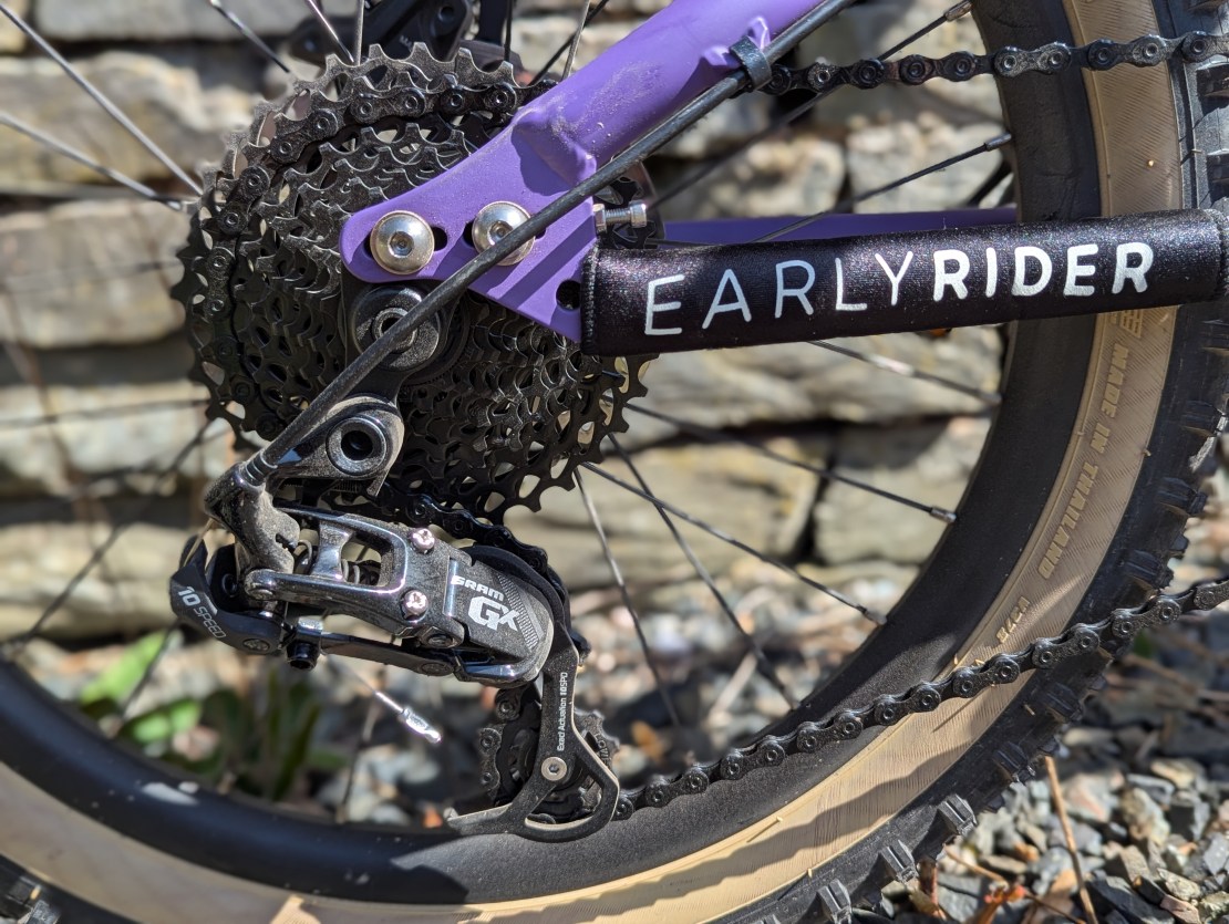The frame and fork feature thru-axles rather than the bolted quick release of Early Rider’s other models, and you can also tweak the wheelbase length slightly, thanks to the rear sliding dropout.