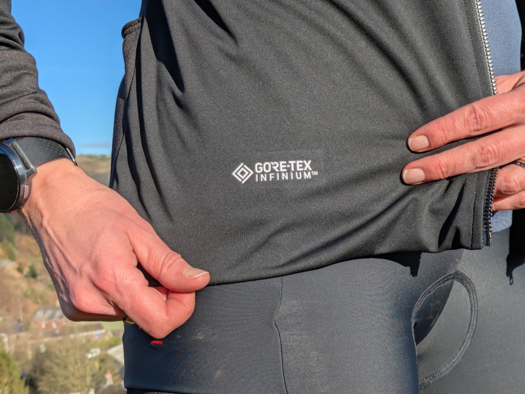 It’s made by Gore Tex, but this Infinium fabric is not waterproof, but it does a reasonable job of keeping light spray or drizzle off you. Where this jacket is great is on a frosty morning rides or sommutes.